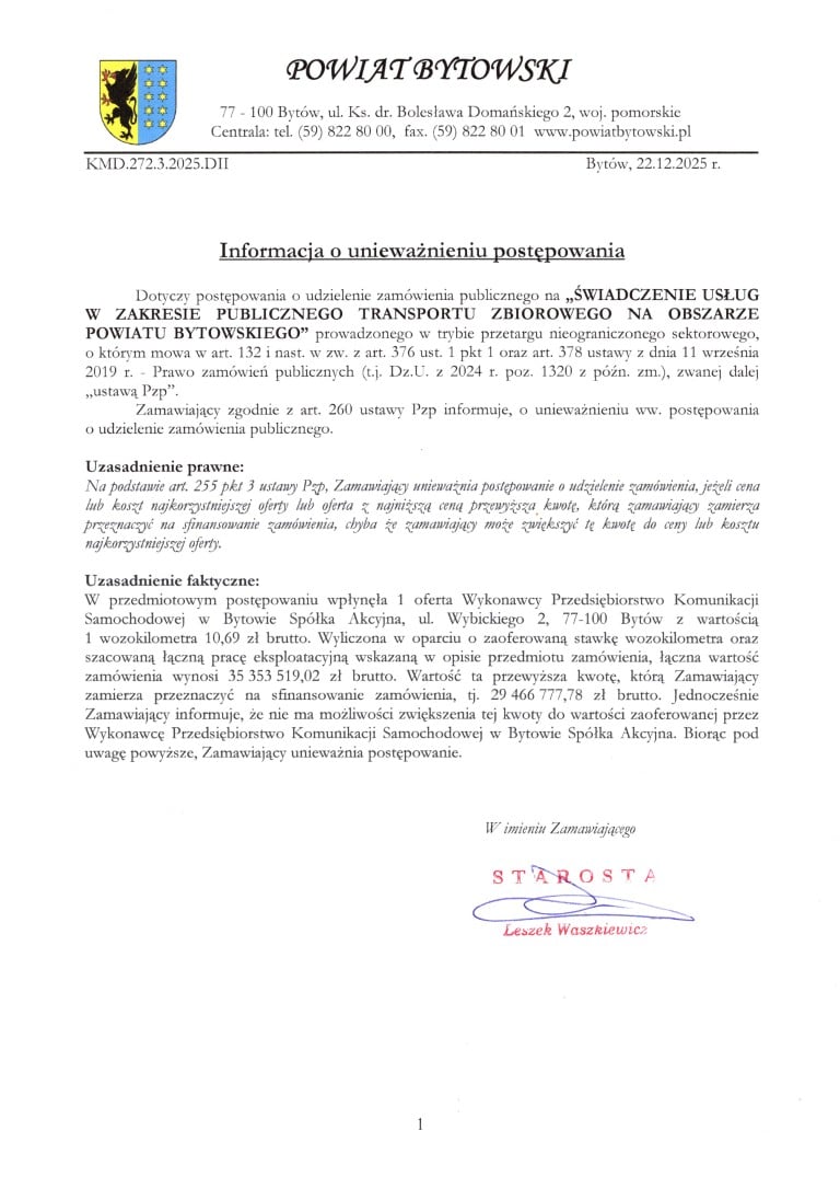 Różnica pomiędzy ofertą a możliwościami finansowymi zamawiającego okazała się zbyt duża, aby można było podpisać umowę. Powiat poinformował jednocześnie, że nie ma możliwości zwiększenia środków przeznaczonych na sfinansowanie zamówienia. W związku z tym, na podstawie art. 255 pkt 3 ustawy Prawo zamówień publicznych, postępowanie zostało formalnie unieważnione. Decyzja ta oznaczała konieczność przygotowania nowego podejścia do organizacji transportu publicznego na 14 liniach autobusowych w Powiecie Bytowskim – o czym piszemy powyżej,