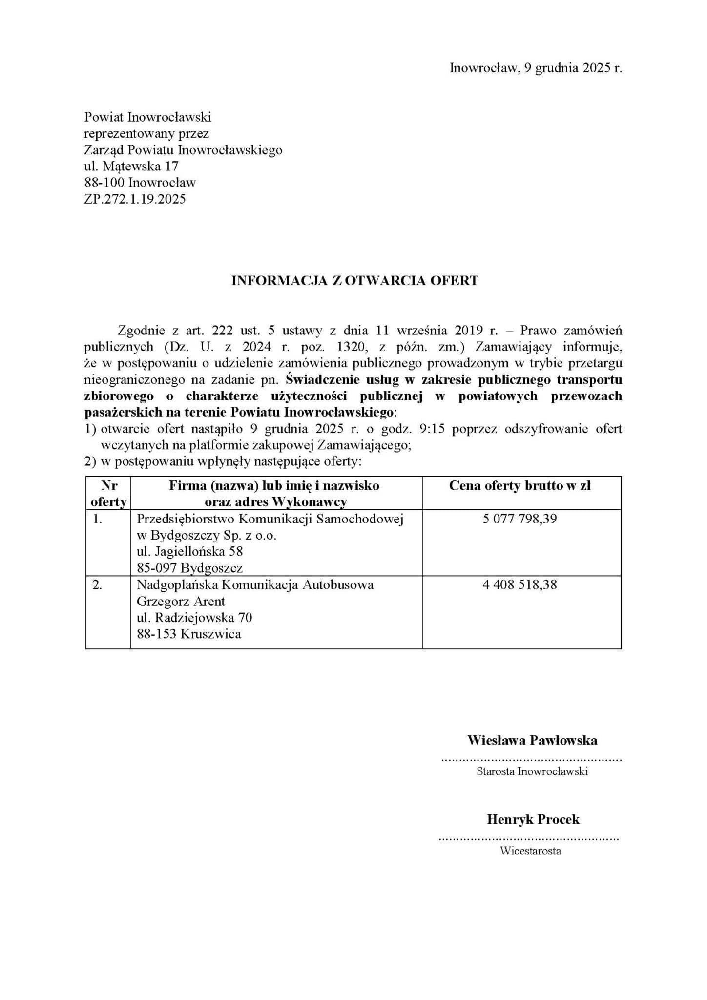 Powiat Inowrocławski 9 grudnia 2025 r. otworzył oferty w przetargu na kompleksową obsługę 14 linii autobusowych w formule publicznego transportu zbiorowego.