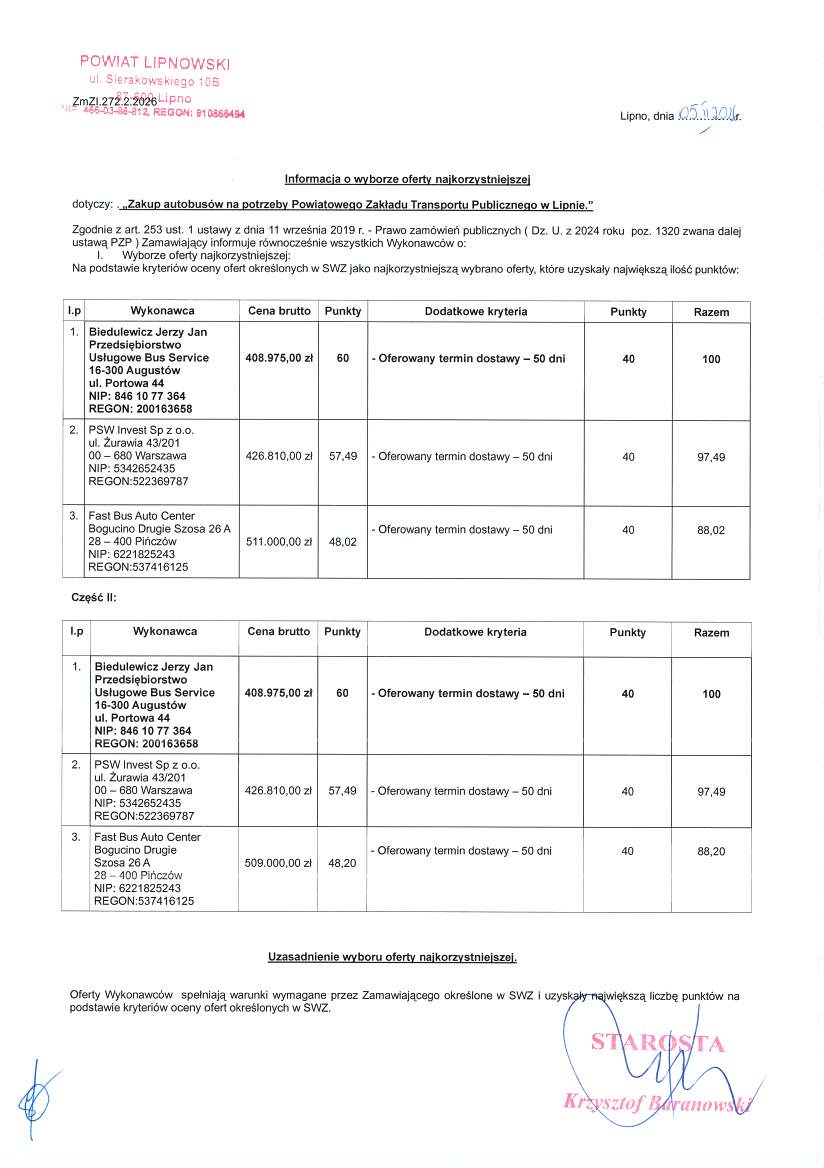 Analiza punktowa potwierdziła przewagę cenową firmy z Augustowa. W obu częściach Bus Service uzyskał maksymalną liczbę 100 punktów (60 pkt za cenę i 40 pkt za termin dostawy). PSW Invest Sp. z o.o. otrzymał 97,49 pkt, natomiast Fast Bus Auto Center – odpowiednio 88,02 pkt w części I oraz 88,20 pkt w części II.
