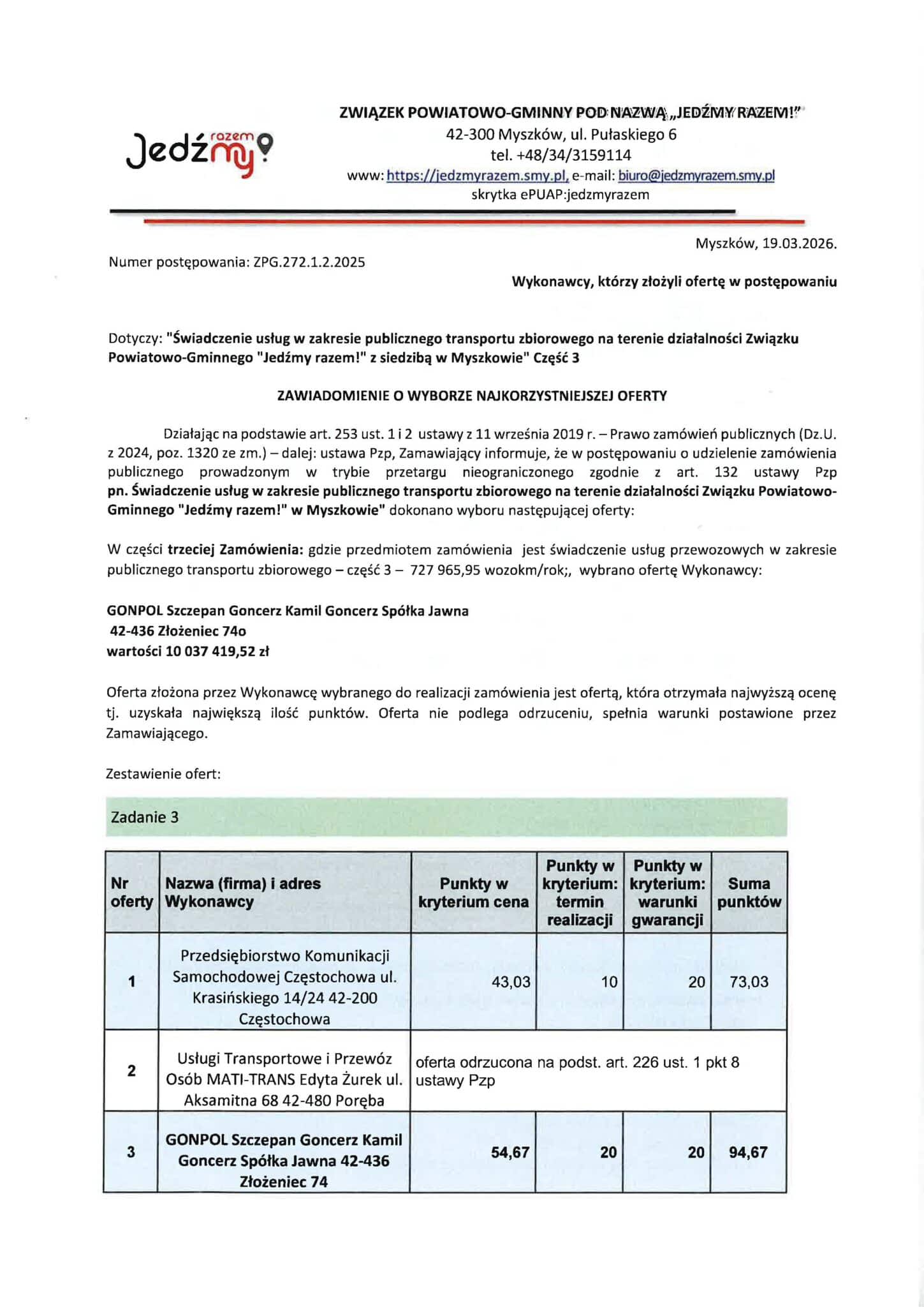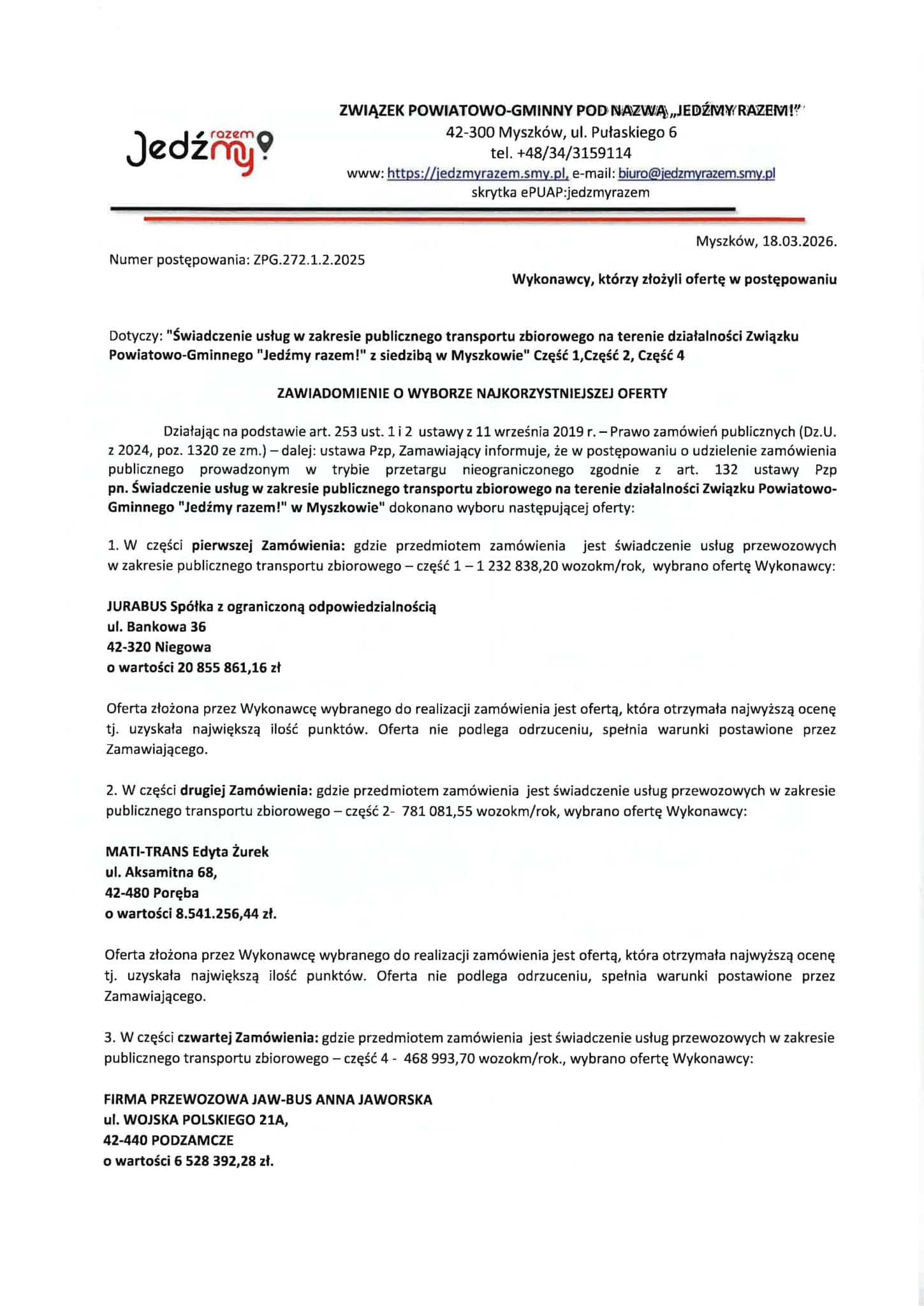 18 i 19 marca 2026 roku Związek Powiatowo-Gminny „Jedźmy razem!” z siedzibą w Myszkowie rozstrzygnął wszystkie części przetargu na obsługę autobusowego transportu publicznego.