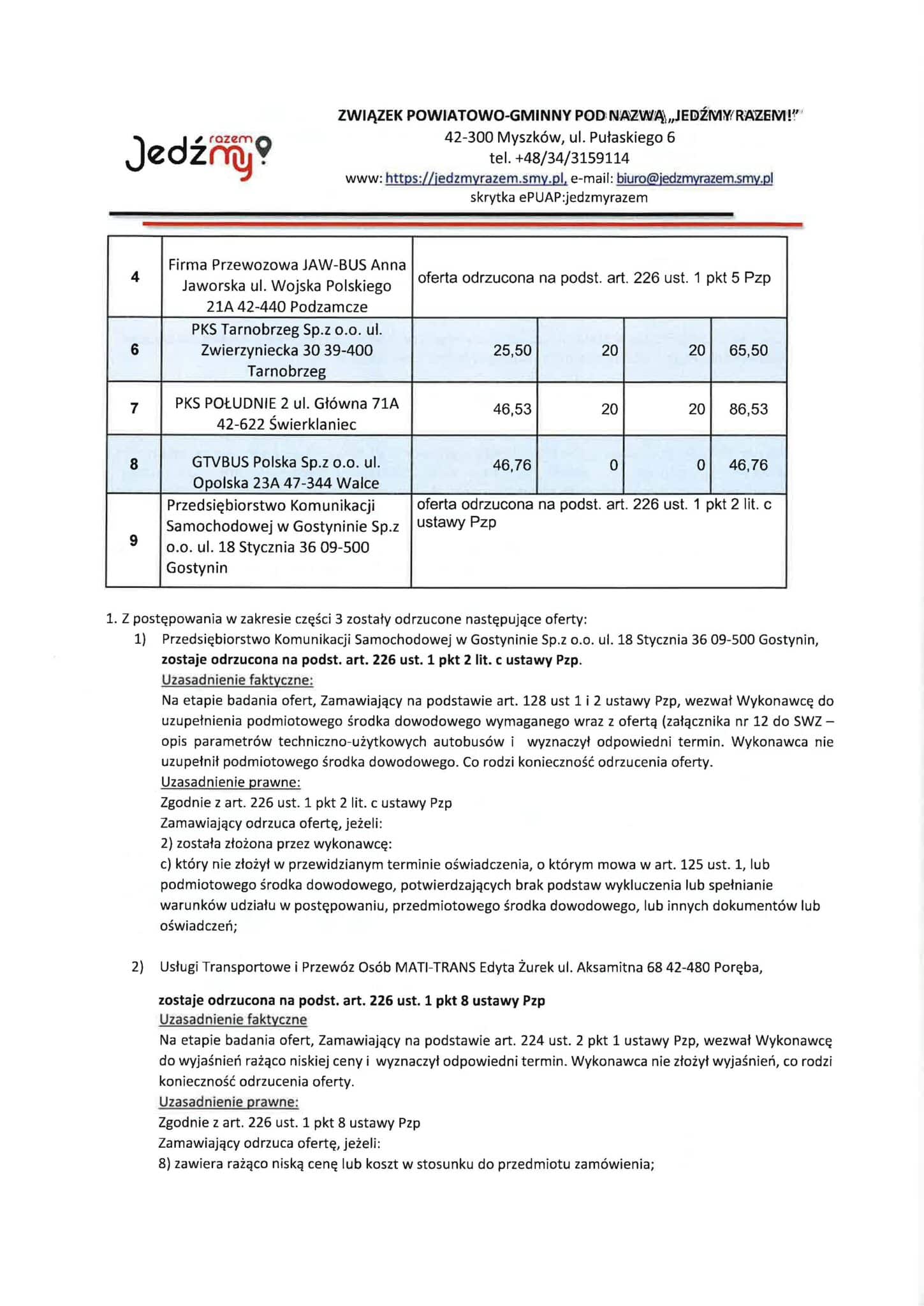 - Jaw-Bus Anna Jaworska – oferta odrzucona