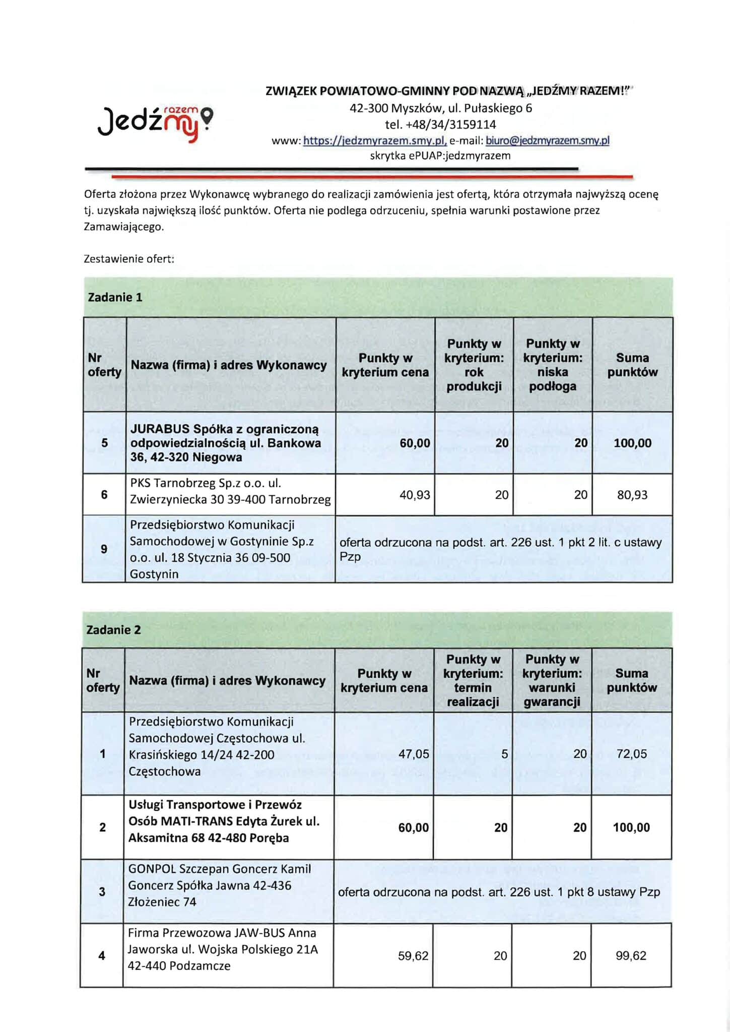 - Jurabus Sp. z o.o. – 60,00 (cena) + 20 (rok) + 20 (niska podłoga) = 100,00 pkt