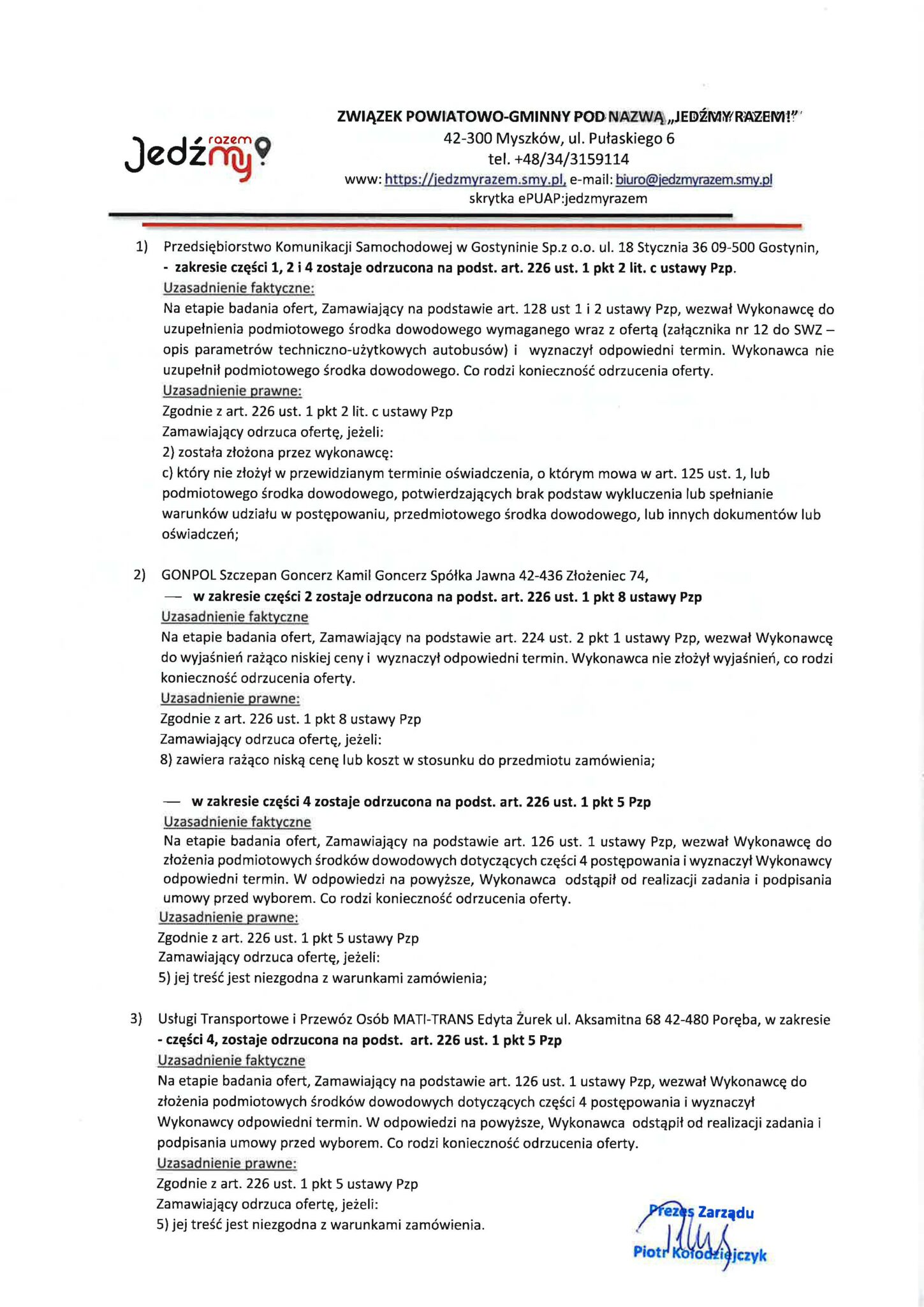 - PKS Gostynin Sp. z o.o. – oferta odrzucona