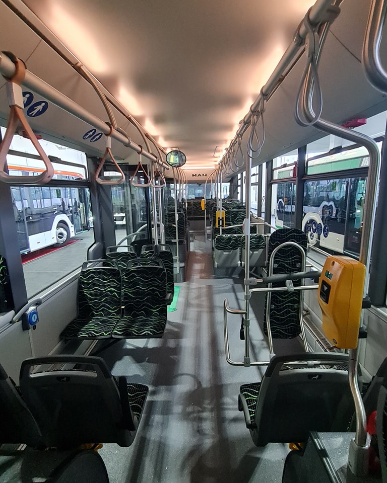 Pasażerowie pojadą na siedzeniach wyklejonych wykładziną tapicerowaną. Stanowisko pracy kierowcy stanowić ma kabina typu zamkniętego z radiem i podwójną ładowarką USB. Przednie skrzydło I drzwi ma być oddzielone od przestrzeni pasażerskie i stanowić będzie wejście do kabiny kierowcy. Ładowarki USB znajdą się również w przedziale pasażerskim.