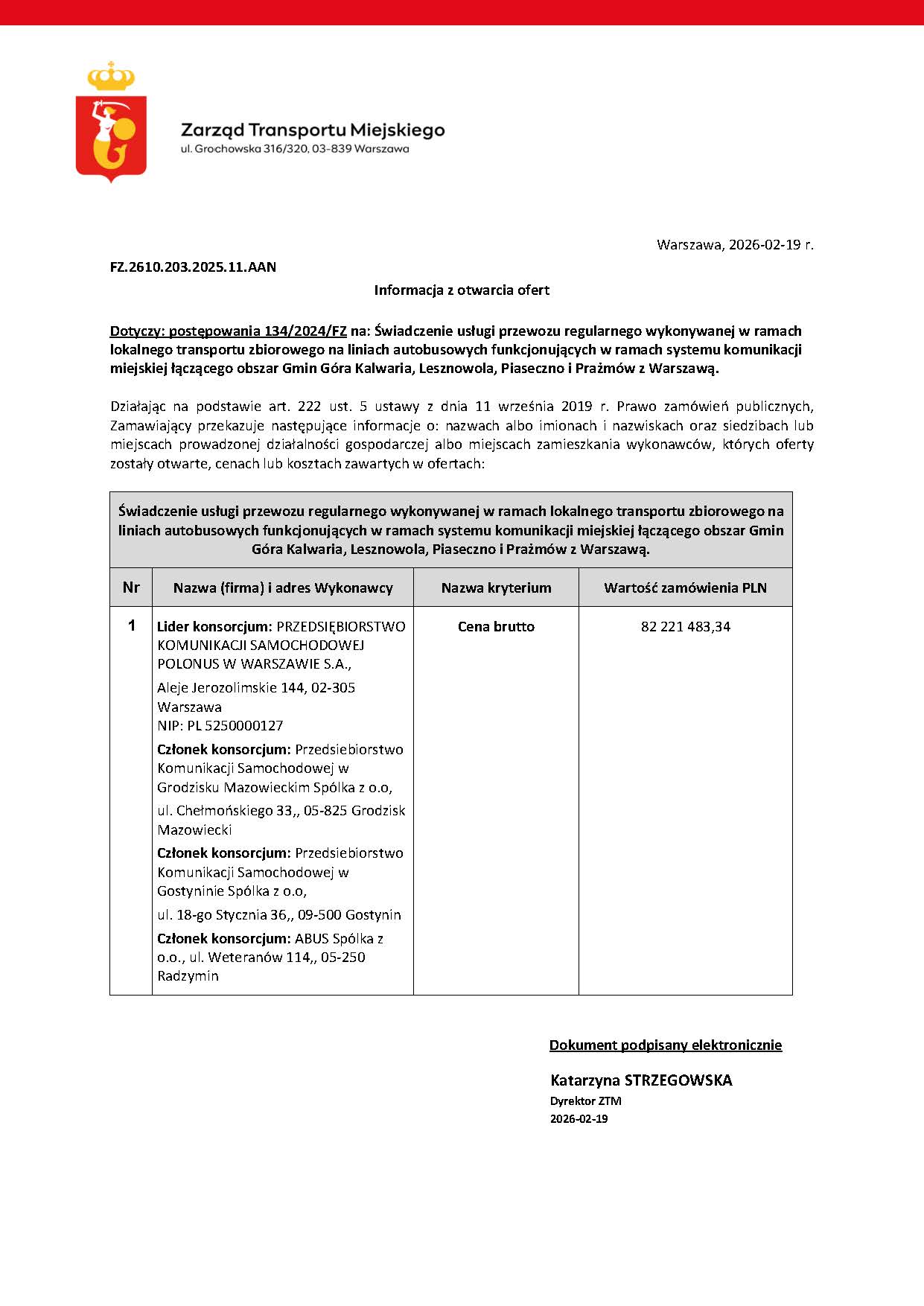 Jedyną ofertę złożyło konsorcjum firm: lider PKS Polonus w Warszawie S.A., a także PKS w Grodzisku Mazowieckim Sp. z o.o., PKS w Gostyninie Sp. z o.o. oraz Abus Sp. z o.o.. Zaproponowana cena to 82.221.483,34 PLN brutto, co przy stawce VAT 8% oznacza 76.130.999,39 PLN netto. Przy pracy przewozowej na poziomie 7.271.347 wzkm daje to cenę jednostkową 1 wzkm netto na poziomie – 10,47 PLN netto.