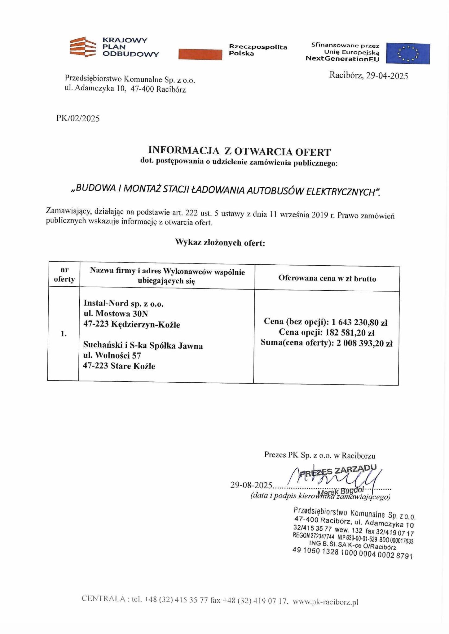 W przetargu wpłynęła jedna oferta: konsorcjum Instal-Nord sp. z o.o. z Kędzierzyna-Koźla oraz Suchański i S-ka Spółka Jawna ze Starego Koźla. Cena podstawowa wyniosła 1.643.230,80 PLN brutto (co odpowiada 1.336.000 PLN netto), a cena opcji – 182.581,20 PLN brutto (ok. 149.000 PLN netto). Łączna suma oferty to 2.008.393,20 PLN brutto, czyli ok. 1.631.000 PLN netto.