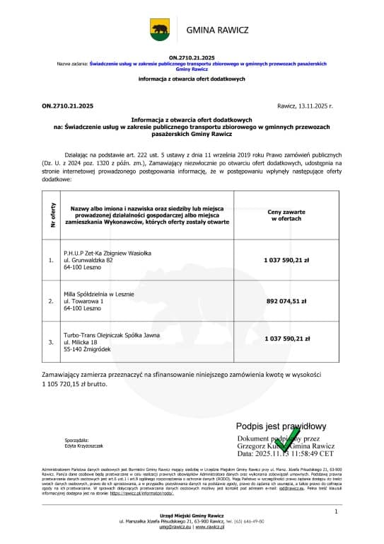 W dniu 20 listopada 2025 Gmina Rawicz poinformowała o wyborze najkorzystniejszej oferty w postępowaniu na świadczenie gminnych przewozów pasażerskich.