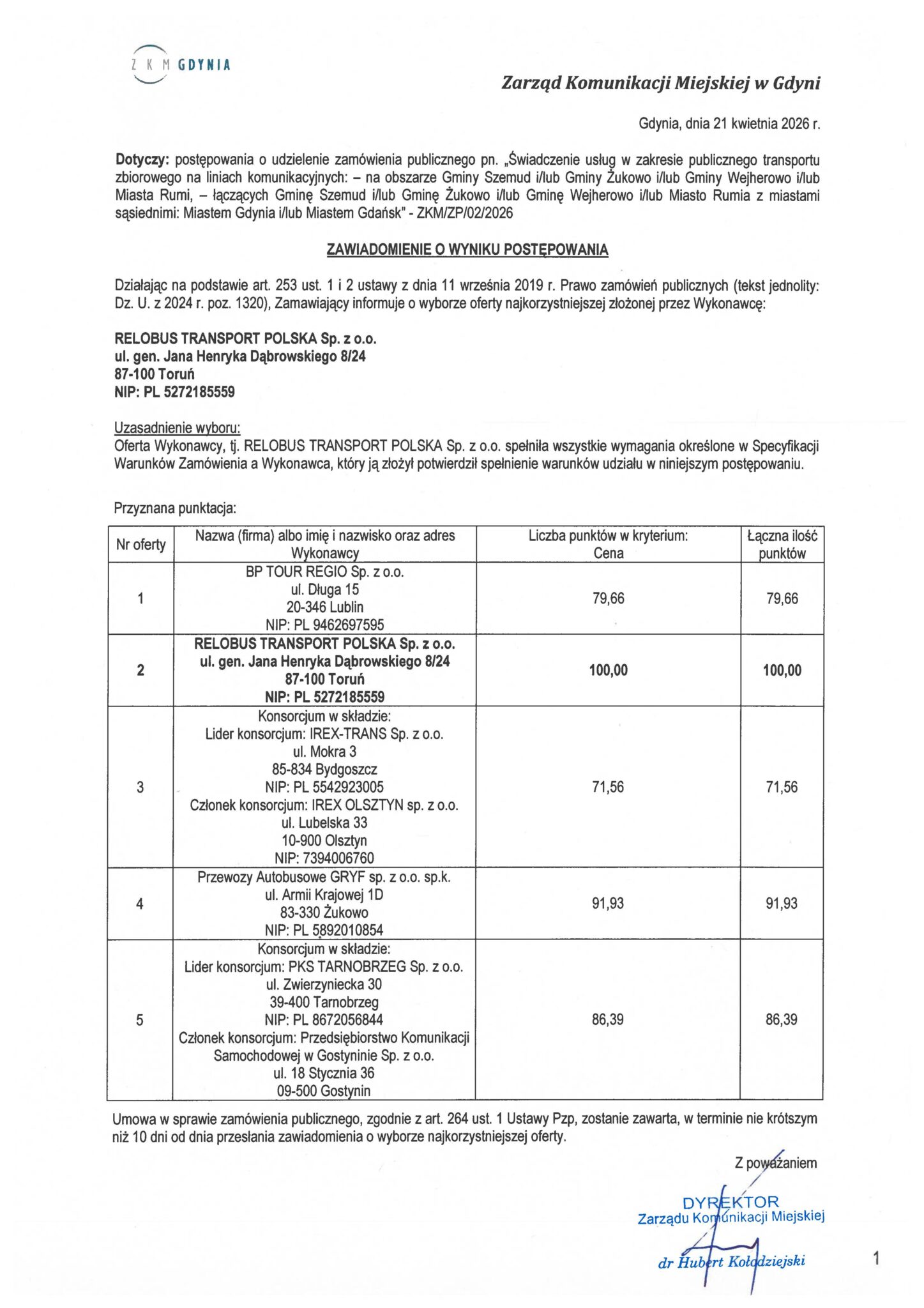 21 kwietnia 2026 roku Zarząd Komunikacji Miejskiej w Gdyni wybrał najkorzystniejszą ofertę w przetargu na obsługę linii autobusowych komunikacji aglomeracyjnej.