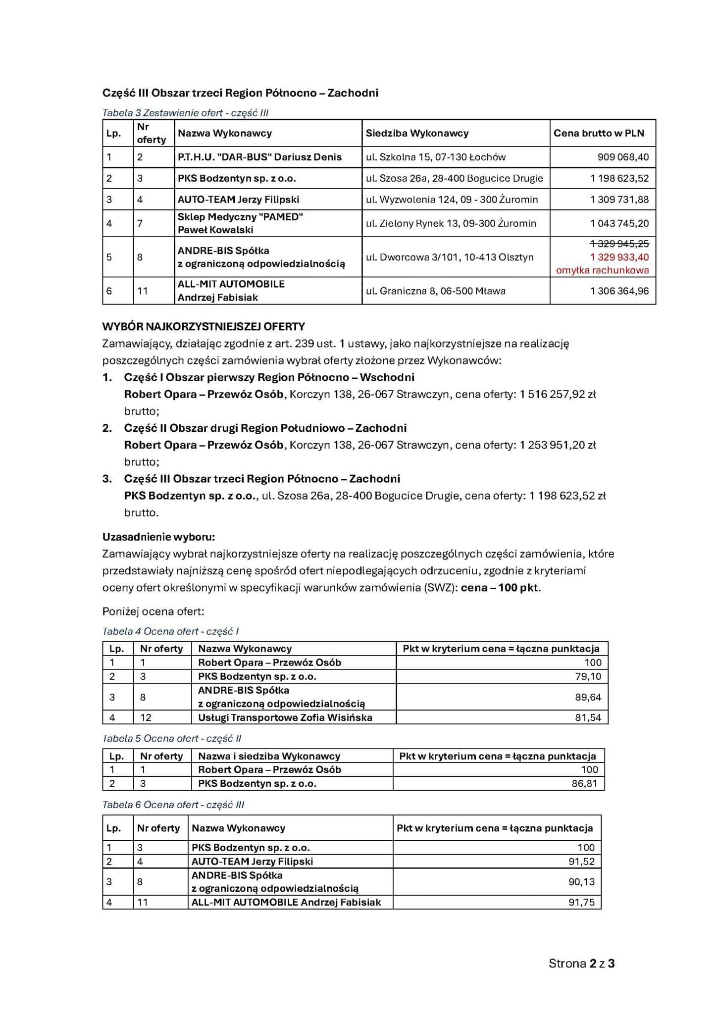 - W części III (Region Północno-Zachodni) najkorzystniejszą ofertę złożył PKS Bodzentyn za 1.198.623,52 PLN brutto (to 974.490,67 PLN netto), co daje cenę jednostkową netto za jeden wozokilometr na poziomie – 2,89 PLN netto. W tej części do rywalizacji stanęli też: P.t.h.u. Dar-bus Dariusz Denis – 909.068,40 PLN brutto / 739.079,19 PLN netto (czyli 2,19 PLN netto), Auto-team Jerzy Filipski – 1.309.731,88 PLN brutto / 1.064.822,67 PLN netto (czyli 3,16 PLN netto), Sklep Medyczny Pamed Paweł Kowalski – 1.043.745,20 PLN brutto / 848.573,33 PLN netto (czyli 2,52 PLN netto), Andre-bis – 1.329.945,25 PLN brutto / 1.081.256,30 PLN netto (czyli 3,21 PLN netto) oraz All-mit Automobile Andrzej Fabisiak – 1.306.364,96 PLN brutto / 1.062.898,34 PLN netto (czyli 3,16 PLN netto). W dokumentach wskazano też korektę w ofercie Andre-bis (omyłka rachunkowa), ale na wynik tej części przesądziła finalna cena przyjęta do oceny.