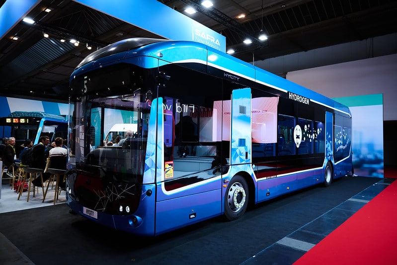 - Pierwszym z prezentowanych modeli był Hycity 12 m – zeroemisyjny autobus z ogniwem paliwowym o mocy 75 kW, wspieranym przez baterię 80 kWh. Pojazd wyposażono w elektryczną oś napędową o mocy 250 kW. Zasięg w warunkach testowych (francuska konfiguracja SORT) miał wynosić nawet do 500 km. SAFRA pokazała również zapowiedź nowej wersji bateryjnej tego samego modelu, planowanej do premiery pod koniec 2025 roku – z silnikiem 450 kW i akumulatorem LFP o pojemności 420 kWh.