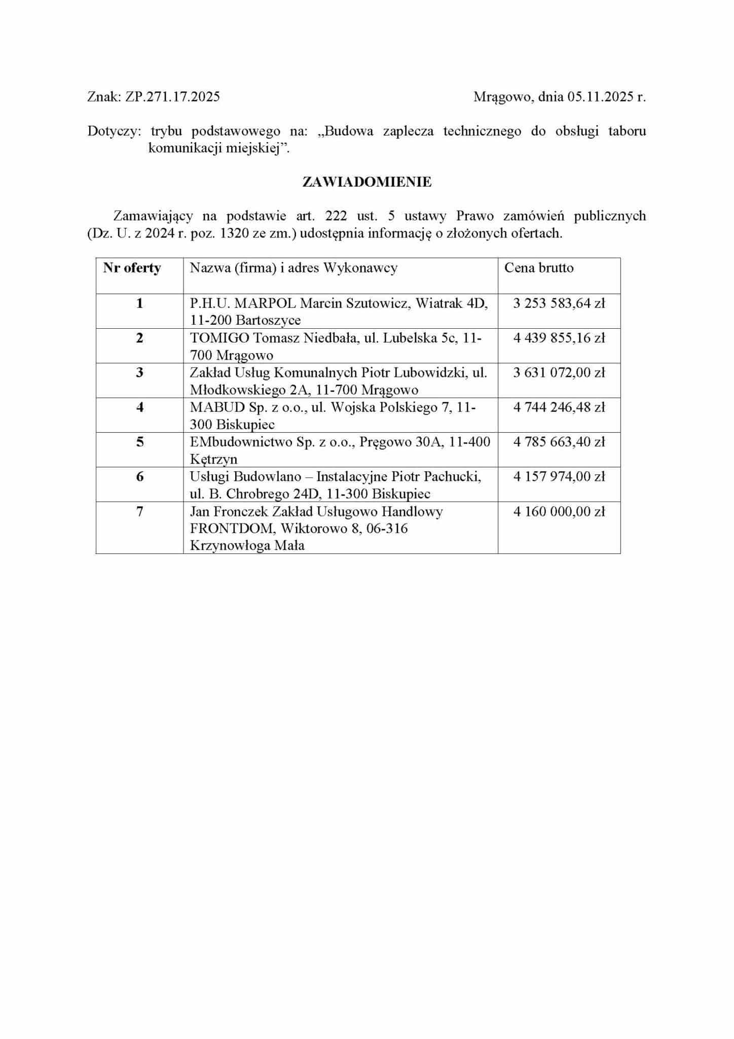 W przetargu złożono siedem ofert. Najniższą cenę zaoferowała firma P.H.U. MARPOL Marcin Szutowicz z Bartoszyc, proponując realizację zadania za 3.253.583,64 PLN brutto (czyli 2.644.378 PLN netto), co daje cenę jednostkową netto za jeden obiekt techniczny na poziomie 2.644.378 PLN netto. Pozostałe oferty przedstawili m.in. Zakład Usług Komunalnych Piotr Lubowidzki (3.631.072 PLN brutto / 2.951.276 PLN netto) oraz TOMIGO Tomasz Niedbała (4.439.855,16 PLN brutto / 3.608.821 PLN netto). Najwyższa oferta wpłynęła od firmy EMbudownictwo Sp. z o.o. i wyniosła 4.785.663,40 PLN brutto.