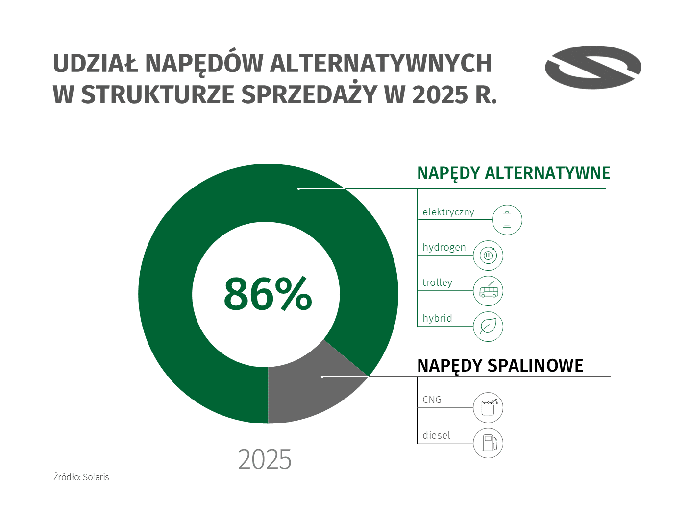 Łącznie pojazdy nisko- i zeroemisyjne stanowiły 86% wszystkich dostaw Solarisa w 2025 roku, co potwierdza konsekwentną strategię producenta skoncentrowaną na transformacji transportu publicznego w kierunku napędów bezemisyjnych.