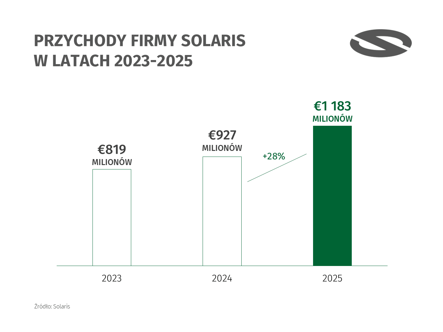 Rok 2025 przyniósł Solaris Bus & Coach wyraźną poprawę wyników finansowych oraz dalsze umocnienie pozycji firmy w segmencie autobusów nisko- i zeroemisyjnych. Przychody producenta osiągnęły poziom 1,183 mld euro, co oznacza wzrost o 28% w porównaniu z 2024 rokiem.