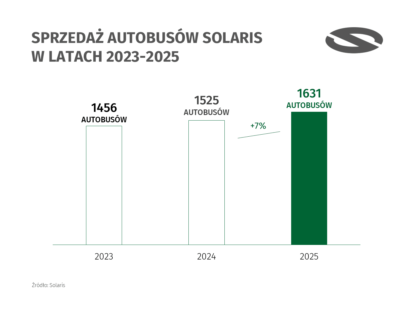 w 2025 roku Solaris dostarczył 1 631 pojazdów do klientów w 15 krajach. Oznacza to wzrost sprzedaży o 7% rok do rok