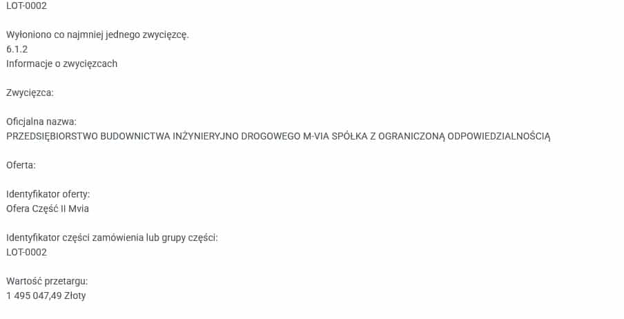W części II, obejmującej pętlę przy ul. Kwiatkowskiego, sytuacja była bardziej jednoznaczna. M-VIA Sp. z o.o. złożyła ofertę na 1.495.047,49 PLN brutto, czyli 1.215.480 PLN netto, wyraźnie tańszą od kolejnych trzech propozycji. Druga w zestawieniu cena – przedstawiona przez STRABAG – wynosiła 2.446.199,98 PLN brutto, a więc była o niemal milion złotych wyższa. Pozostałe wykonawcy, Chamot oraz Przedsiębiorstwo Drogowe, zaproponowali podobne kwoty, odpowiednio 2.334.498,19 PLN brutto oraz 2.333.691,00 PLN brutto.