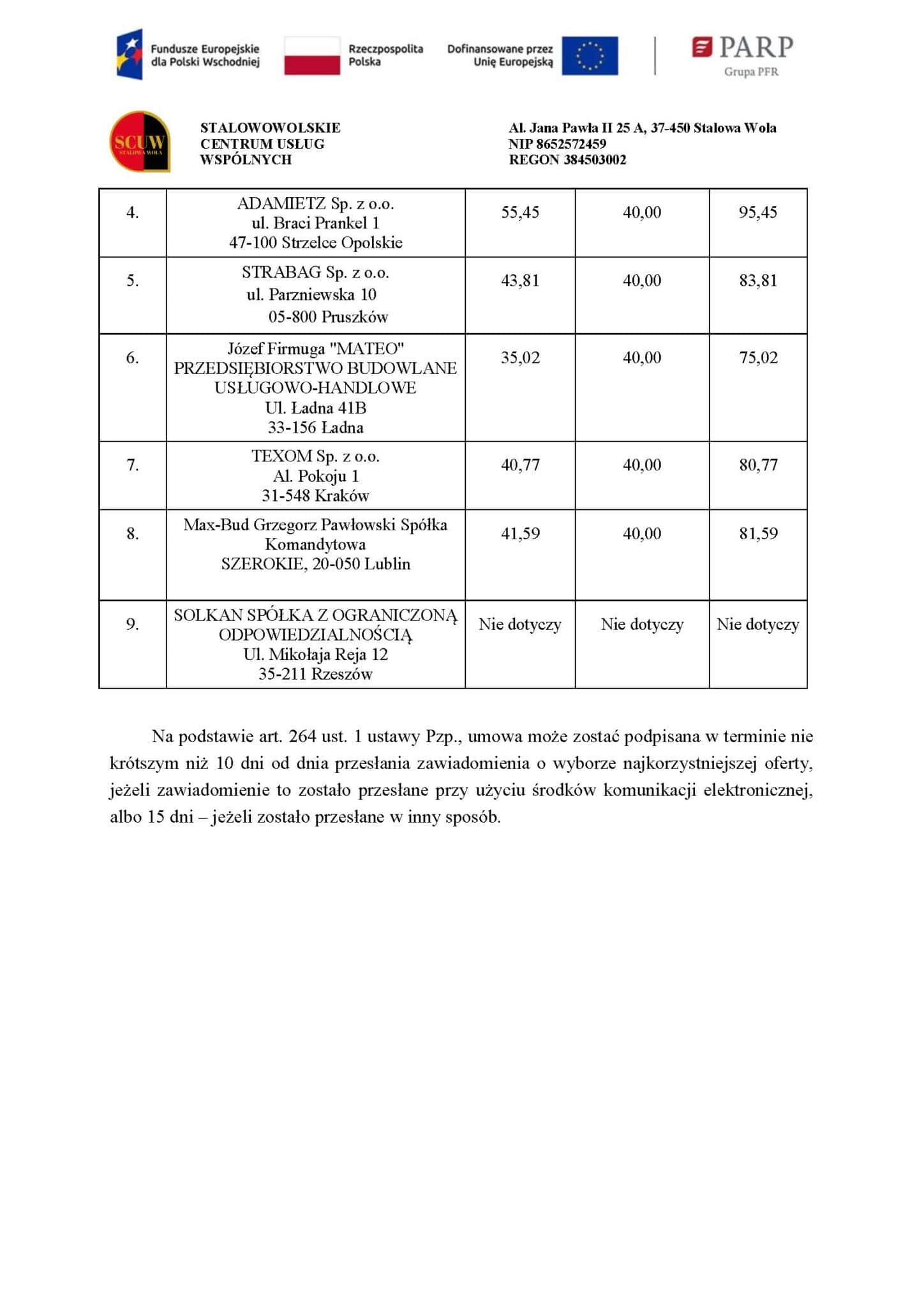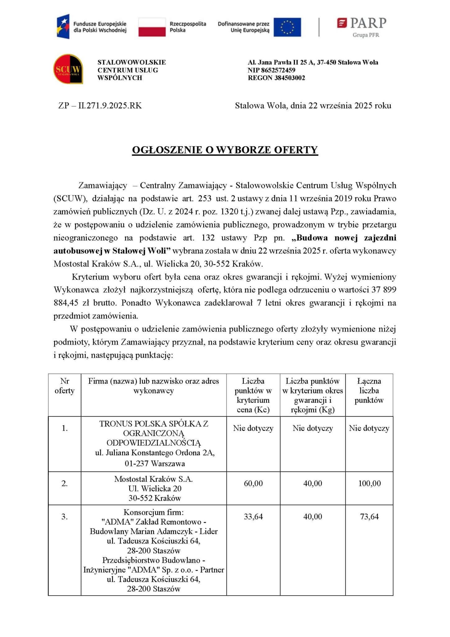 Zwycięska oferta Mostostal Kraków S.A. uzyskała maksymalną ocenę 100 pkt (60 pkt za cenę i 40 pkt za gwarancję). Druga w rankingu była Adameitz Sp. z o.o. z wynikiem 95,45 pkt, natomiast trzecie miejsce zajęło Konsorcjum ADMA – 73,64 pkt. Kluczowym czynnikiem przesądzającym o wyborze była najniższa cena przy maksymalnym okresie gwarancji i rękojmi (7 lat). Pozostałe firmy oferowały porównywalne warunki techniczne, jednak ich ceny znacząco przekraczały budżet SCUW, co wpłynęło na ich niższą ocenę.