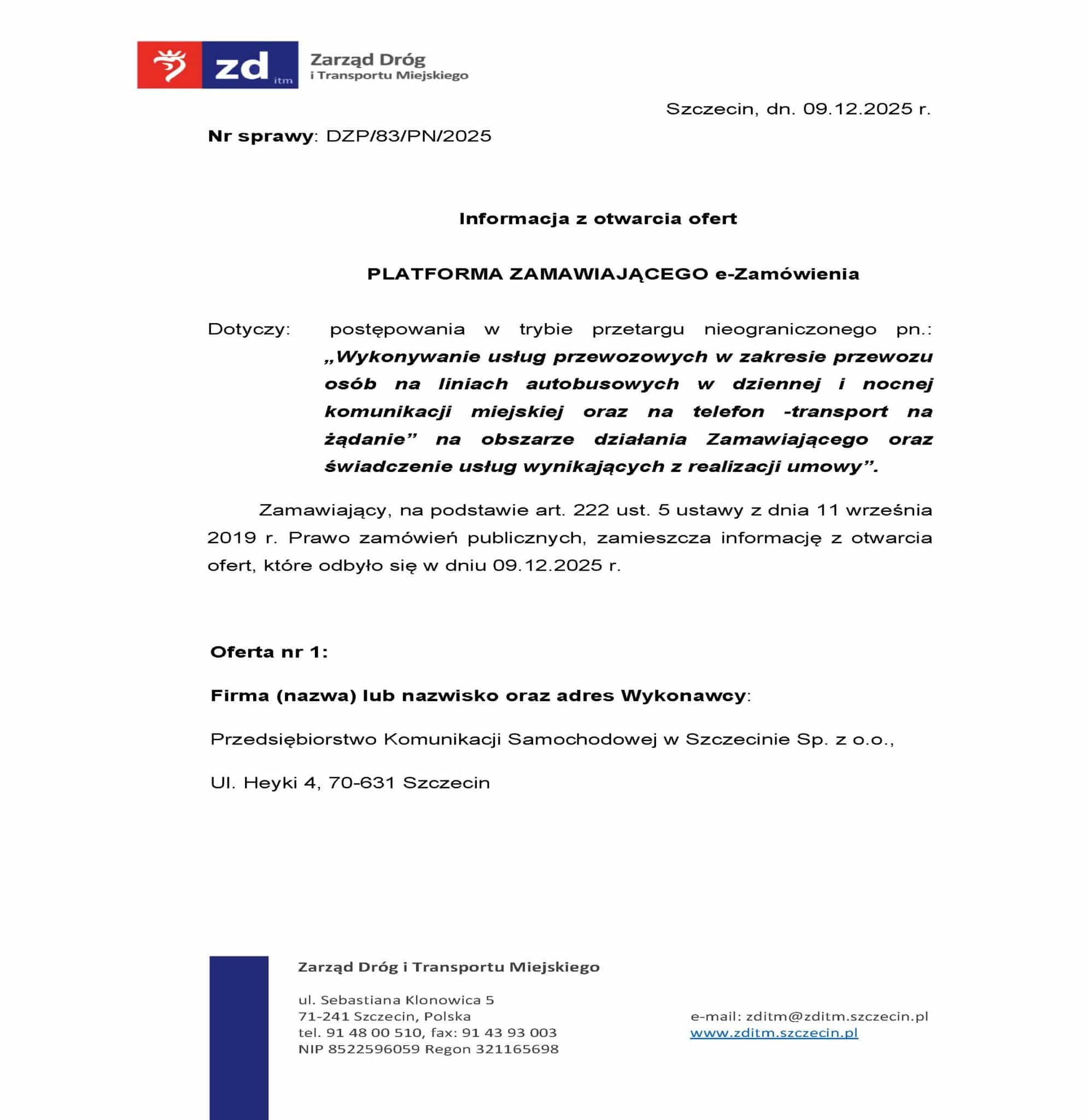 Zgodnie z wieloletnią tradycją wpłynęła jedna oferta – od Przedsiębiorstwa Komunikacji Samochodowej w Szczecinie Sp. z o.o. na kwotę 72.767.615,76 PLN brutto. O tym zamówieniu pisaliśmy już wcześniej w TransInfo.