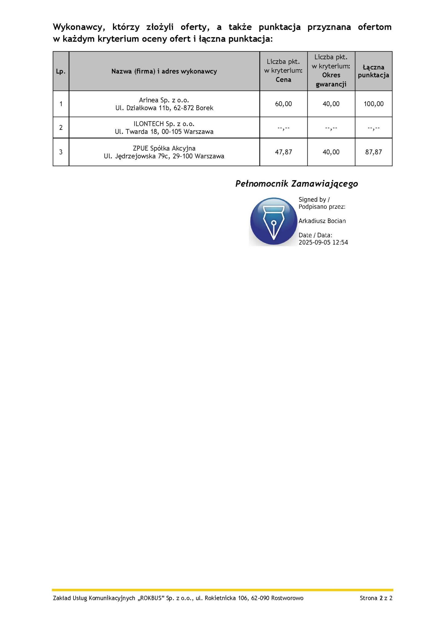 Wybór Arinei można uznać za decyzję wyważoną. Oferta ILONTECH kusiła najniższą ceną, ale wiązała się z wysokim ryzykiem techniczno-wykonawczym. Propozycja ZPUE była poprawna pod względem technicznym, lecz wykraczała poza budżet. Oferta Arinei była stabilna, mieściła się w założonym planie finansowym i zapewniała technologiczną pewność, co przesądziło o jej zwycięstwie.