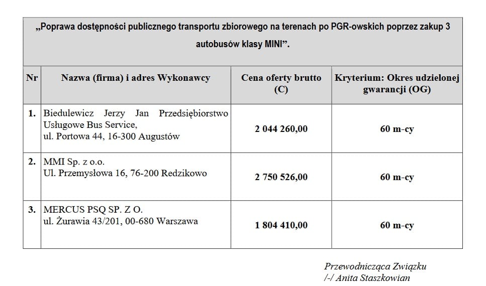 - Biedulewicz Jerzy Jan Przedsiębiorstwo Usługowe Bus Service na sumę 2.044.260,00 PLN brutto / 1.662.200 PLN netto, co daje jednakowy koszt minibusu 554.000 PLN netto + gwarancja na 60 m-cy;