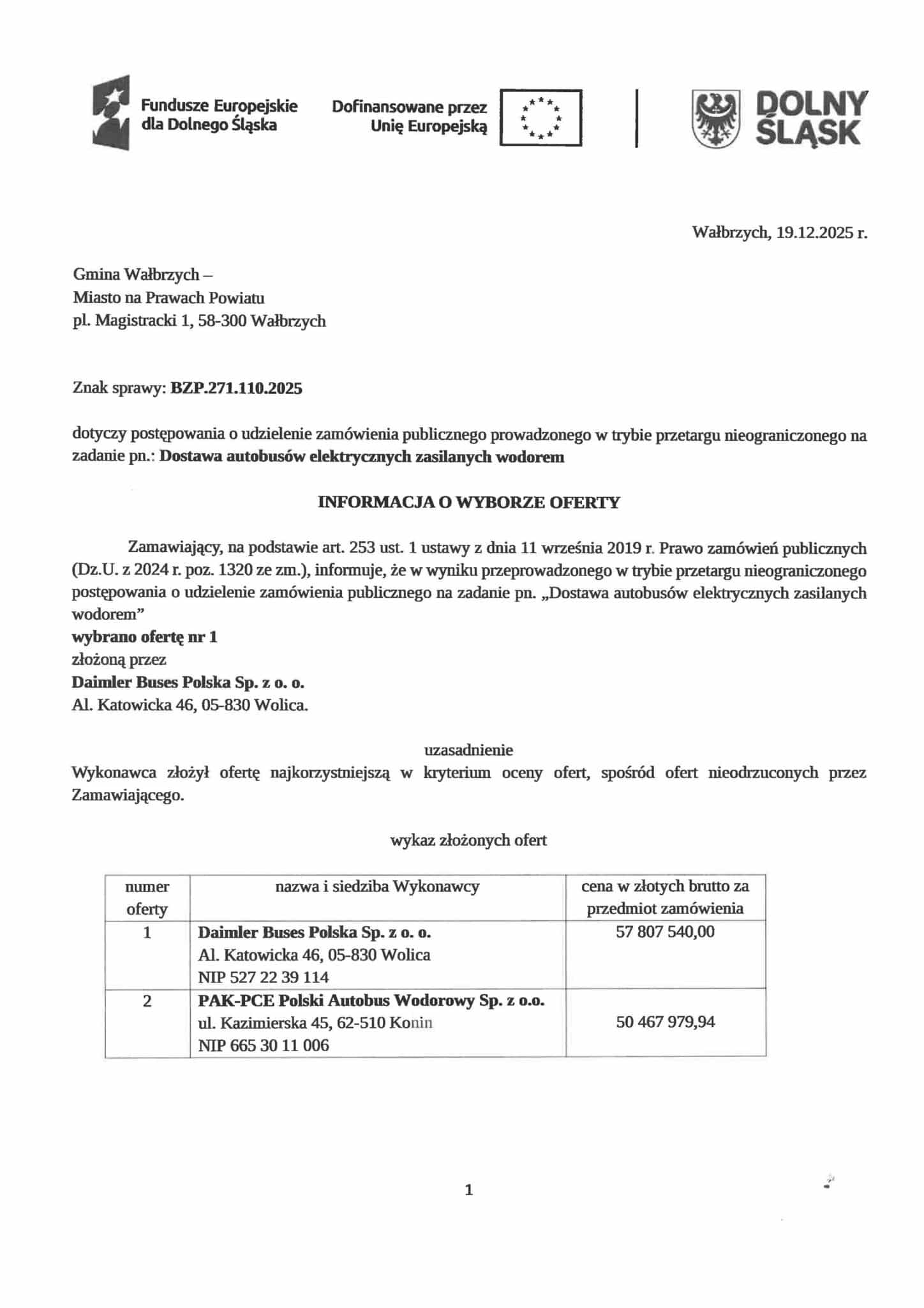 Postępowanie prowadzone przez Gminę Wałbrzych – Miasto na Prawach Powiatu dotyczyło dostawy 14 autobusów elektrycznych zasilanych wodorem, przeznaczonych do obsługi komunikacji miejskiej. Pierwotnie, 15 października 2025 roku, jako najkorzystniejszą wybrano ofertę spółki PAK-PCE Polski Autobus Wodorowy, oferującej model NesoBus 12.
