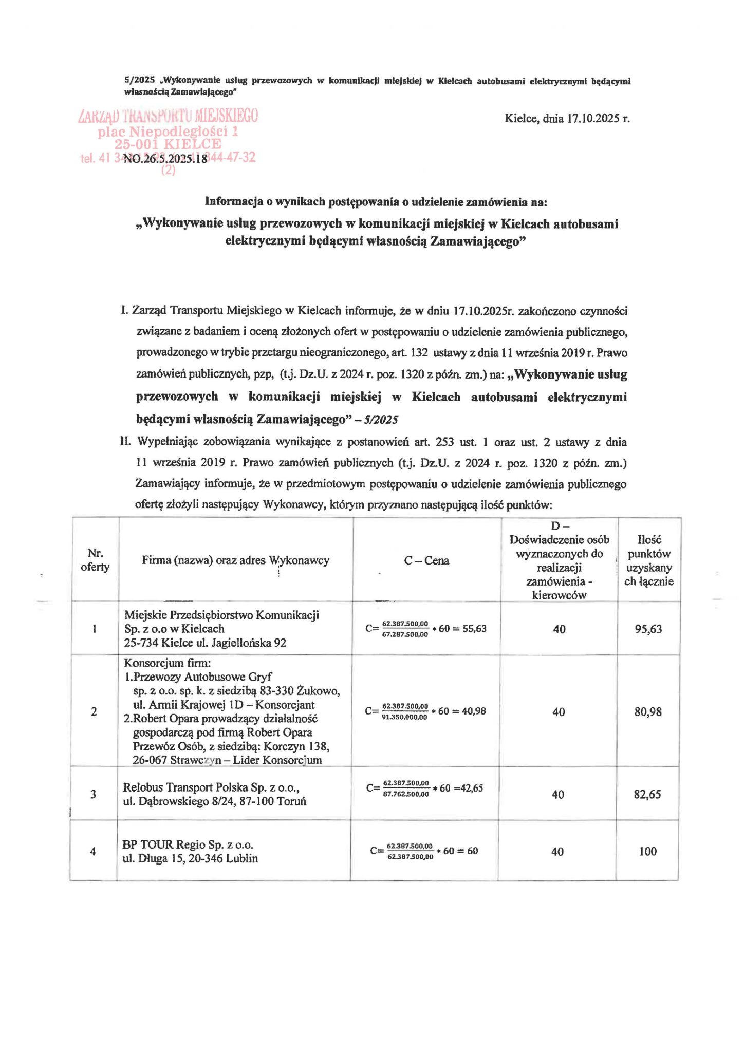 - Najtańszą ofertę złożyła BP TOUR Regio Sp. z o.o. z Lublina, proponując realizację kontraktu za 62.387.500 PLN brutto / 50.722.764 PLN netto, co daje cenę jednostkową netto za jeden wozokilometr na poziomie 5,07 PLN netto.