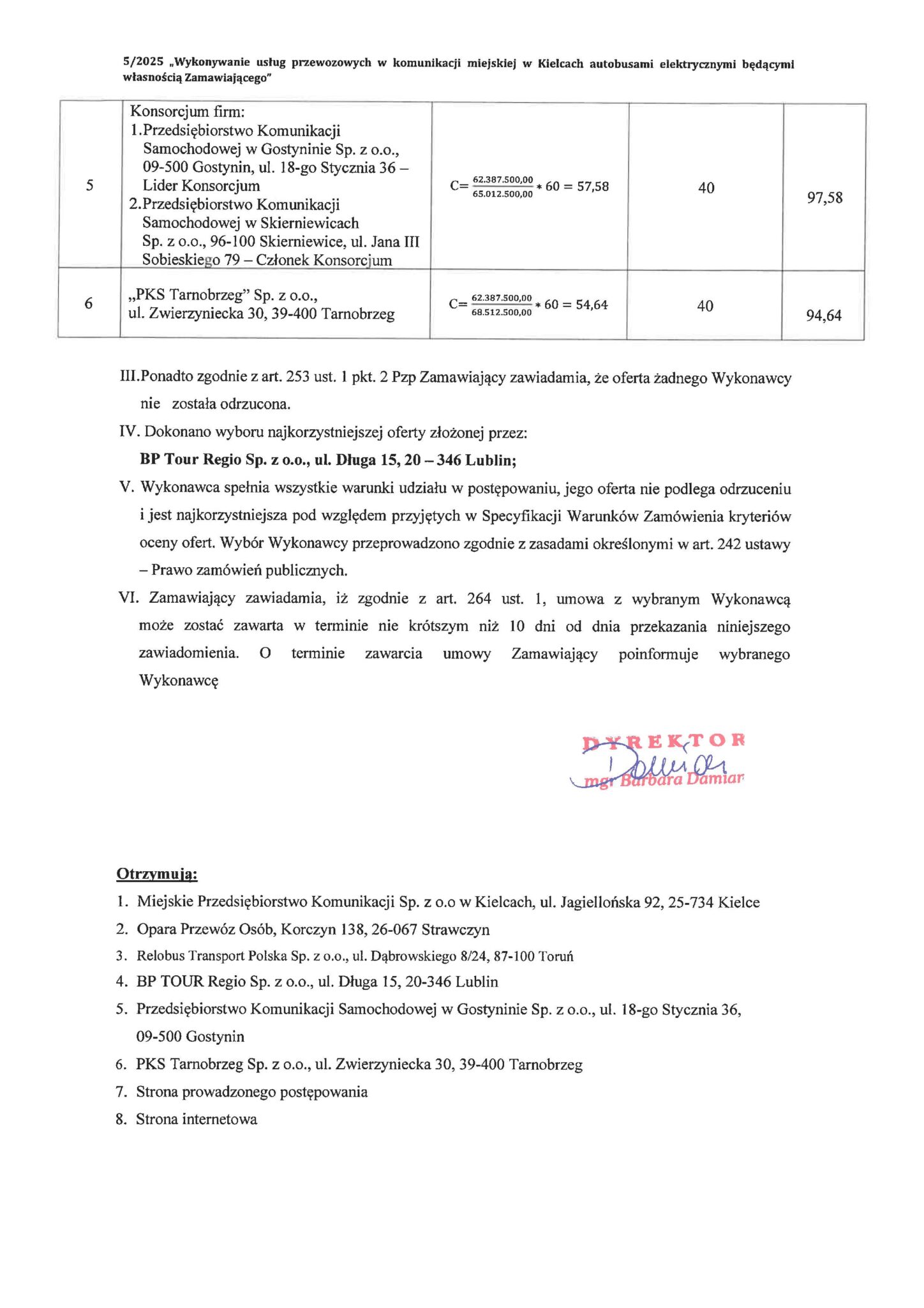 Ostatecznie złożono sześć ważnych ofert, żadna nie została odrzucona. Zwyciężyła oferta BP TOUR Regio z Lublina – zarówno najtańsza, jak i najlepiej oceniona łącznie.