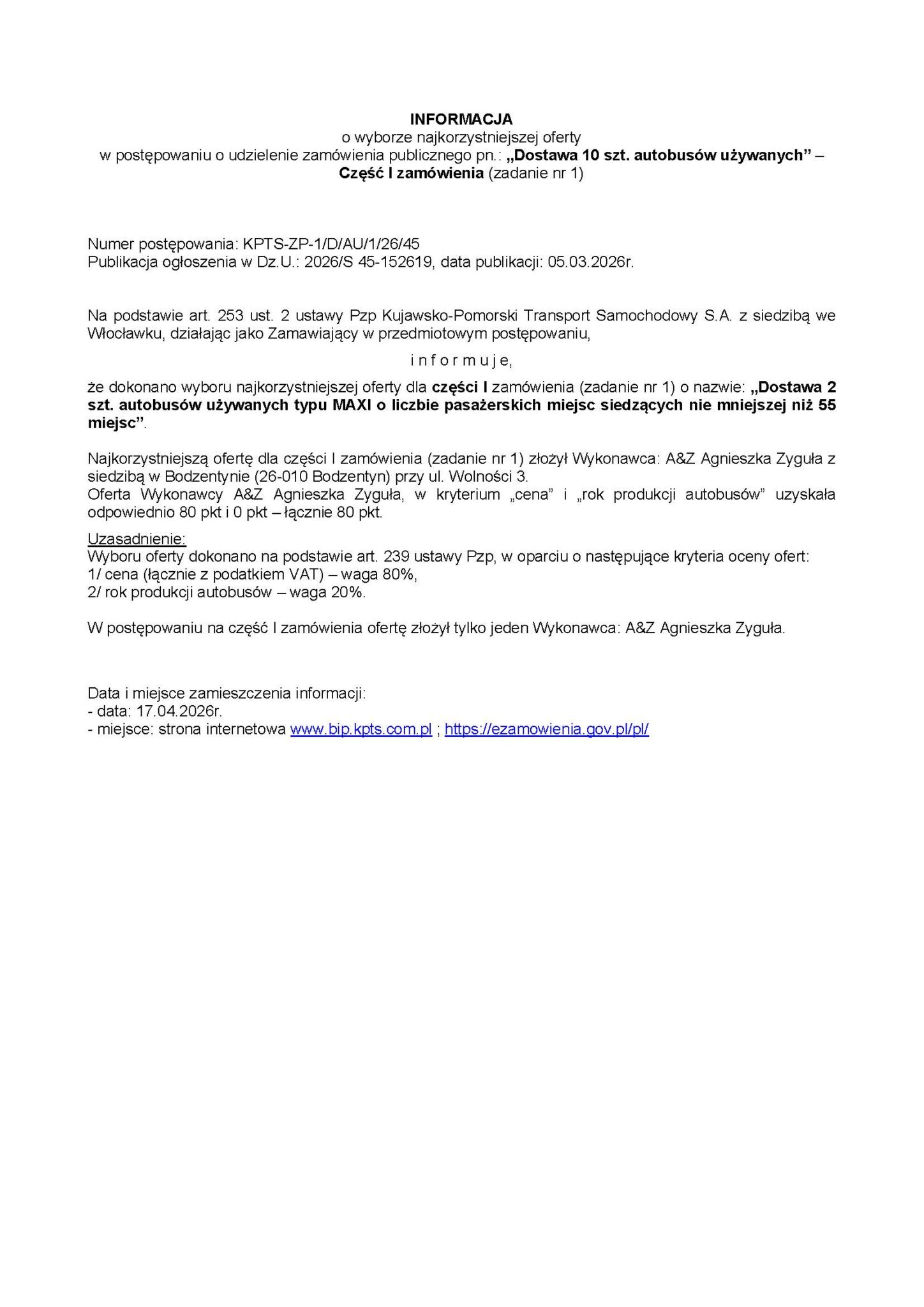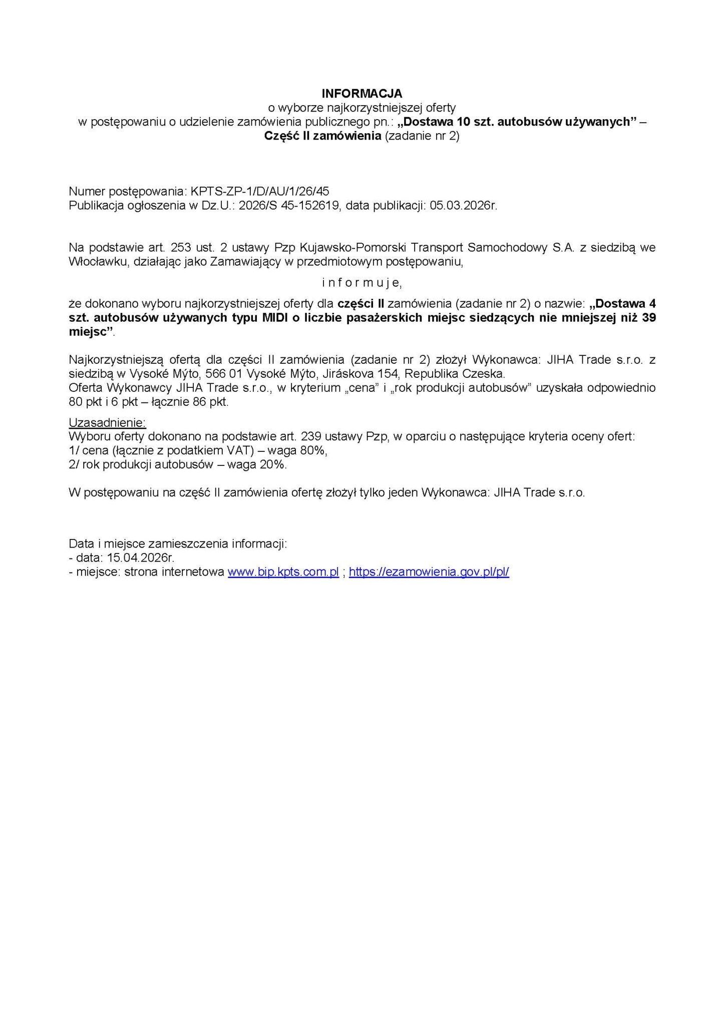 15 i 17 kwietnia 2026 roku Kujawsko-Pomorski Transport Samochodowy we Włocławku rozstrzygnął przetarg na dostawę 10 używanych autobusów
