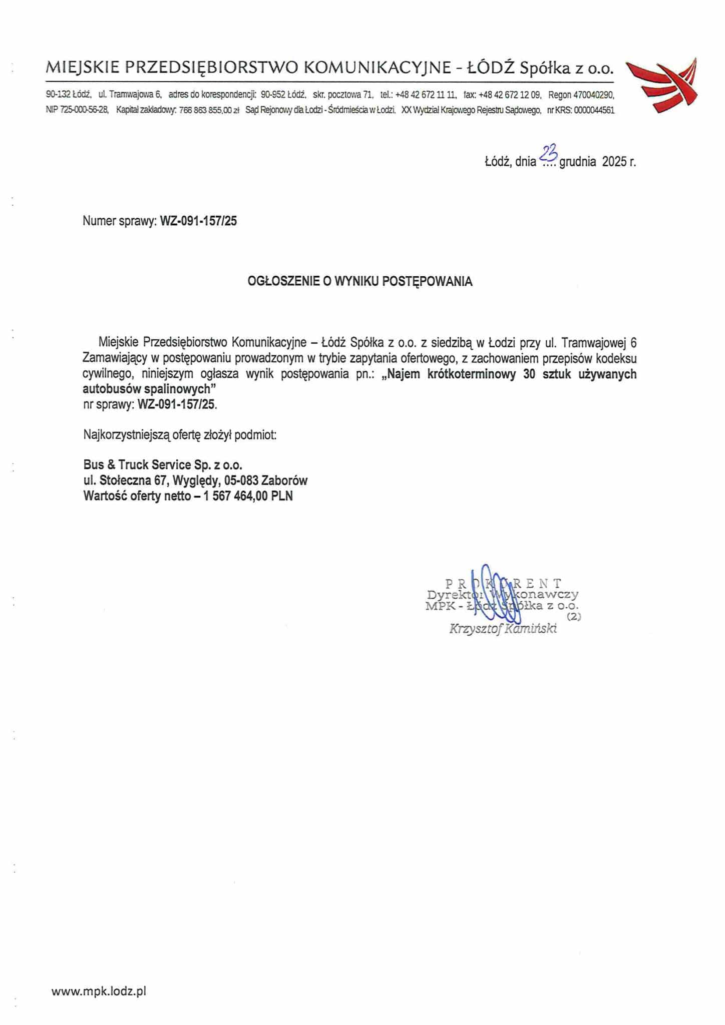 W grudniu 2025 roku MPK Łódź podjęło decyzję o wyborze najkorzystniejszej oferty w postępowaniu na krótkoterminowy najem używanych autobusów miejskich.