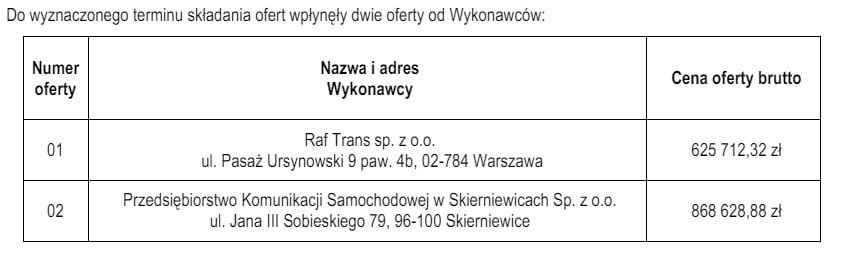 - Przedsiębiorstwo Komunikacji Samochodowej w Skierniewicach sp. z o.o. – cena 868.628,88 PLN brutto.