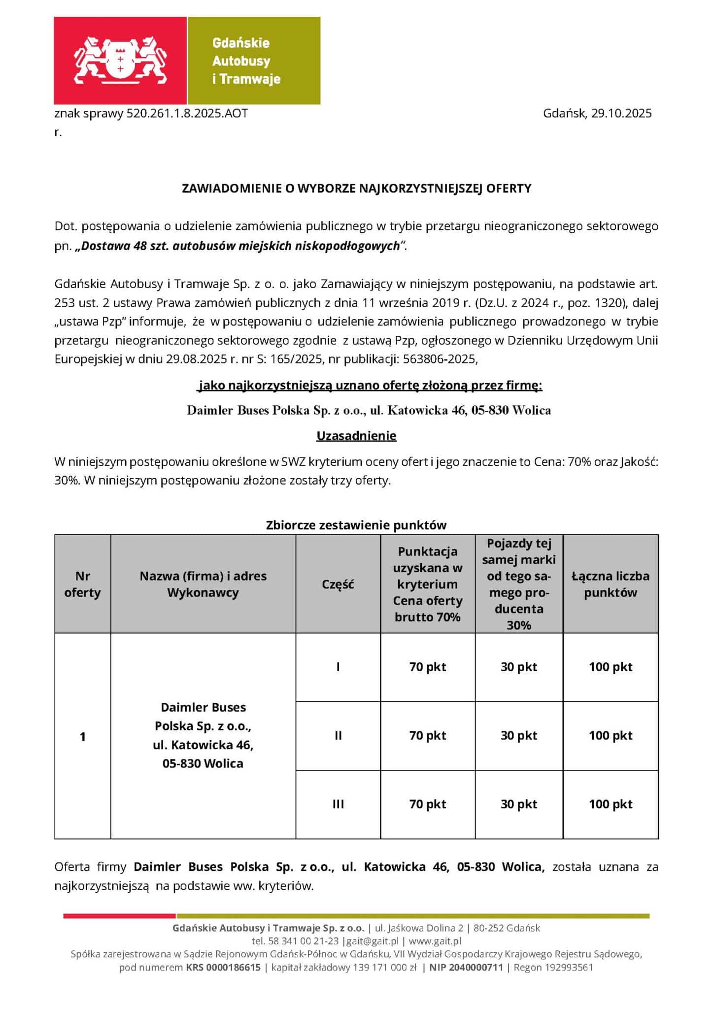 Oznacza to, że wszystkie trzy oferty złożone przez Daimler Buses Polska zmieściły się w budżecie przewidzianym przez GAiT, a w przypadku części II i III oferta znalazła się tuż poniżej progu finansowego, co ułatwiło wybór najkorzystniejszej propozycji. Umowa przewiduje, że przekazanie wykupionych pojazdów nastąpi w ciągu 3 miesięcy od podpisania umowy.