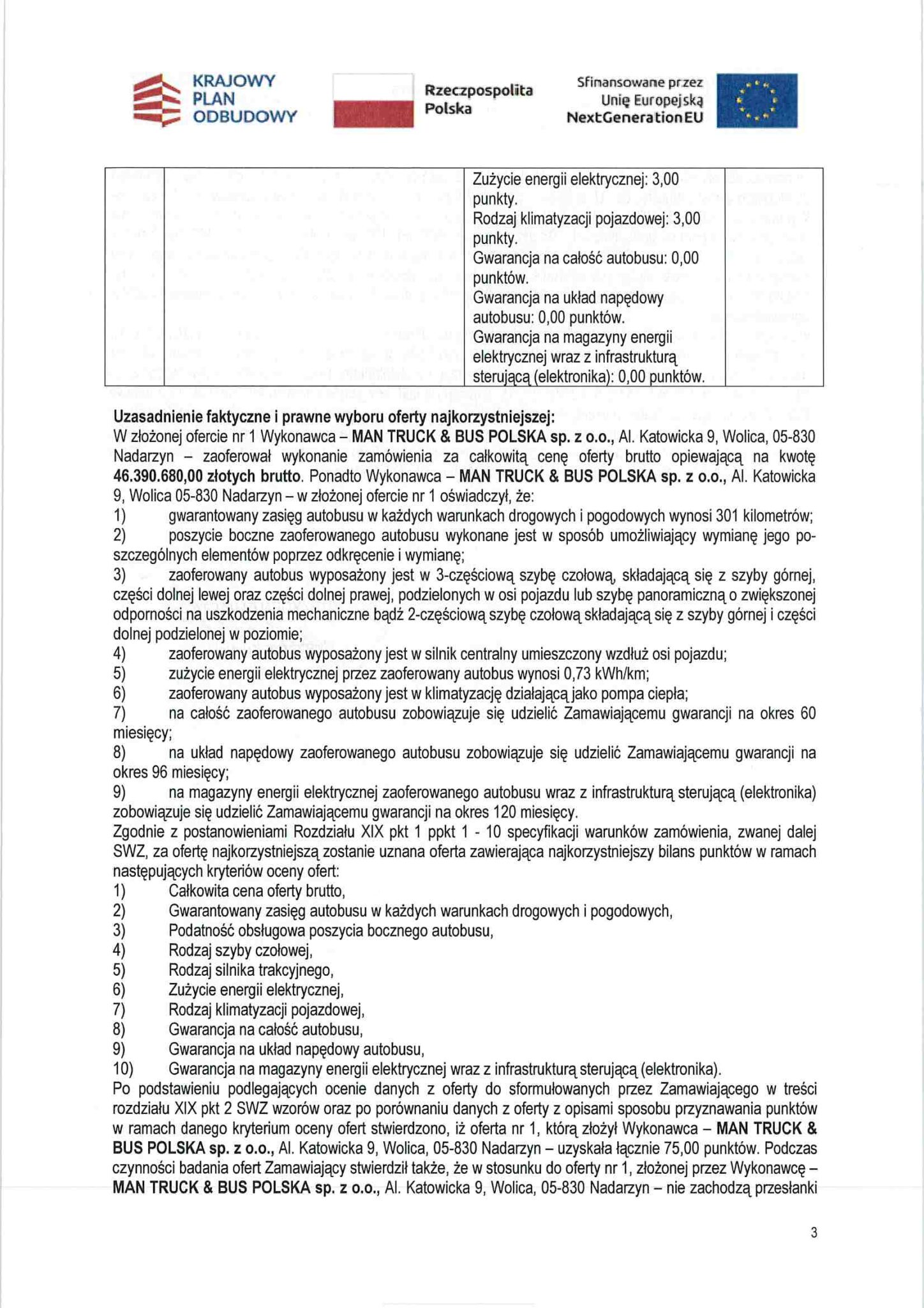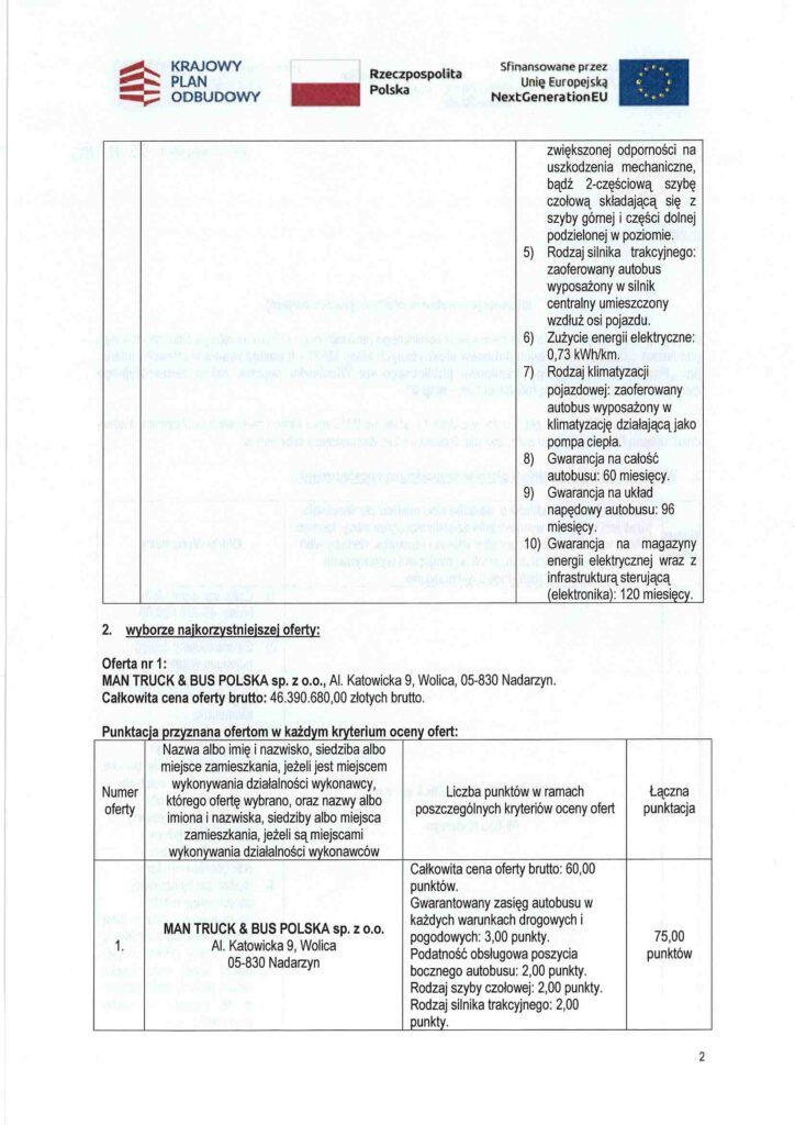 W postępowaniu złożono jedną ofertę, którą komisja przetargowa oceniła zgodnie z określonymi kryteriami. Łączna punktacja oferty MAN Truck & Bus Polska wyniosła 75,00 punktów. W szczegółowej ocenie przyznano: