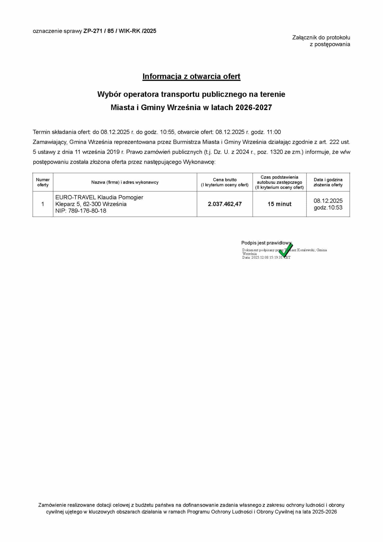 Podczas otwarcia ofert okazało się, że do zamówienia przystąpił jeden wykonawca: EURO-TRAVEL Klaudia Pomogier z Wrześni. To porpozycja o wartości: 2.037.462,47 PLN brutto / 1.886.546,73 PLN netto (przy VAT 8%). Na podstawie szacowanej pracy przewozowej na poziomie ok. 200.000 wzkm za całość dwuletniej umowy, daje to: 9,43 PLN netto za 1 wzkm.