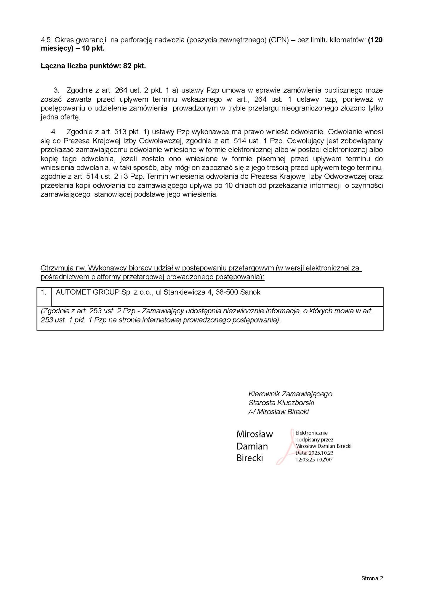 Postępowanie dotyczyło realizacji projektu „Rozwój mobilności miejskiej na terenie powiatu kluczborskiego w oparciu o rozwiązania gospodarki zeroemisyjnej”. Przetarg obejmował zakup dwóch autobusów elektrycznych klasy MIDI oraz mobilnej ładowarki, które mają obsługiwać lokalne i szkolne linie w ramach nowoczesnego systemu transportu publicznego. Inwestycja została dofinansowana z Funduszy Europejskich dla Opolskiego na lata 2021–2027. W postępowaniu złożono jedną ofertę – firma Automet Group zaproponowała wykonanie zamówienia za 3.720.750 PLN brutto, czyli 3.024.187 PLN netto, co daje cenę jednostkową netto za jeden autobus elektryczny na poziomie 1.512.093 PLN netto. Oferta objęła również mobilny punkt ładowania.