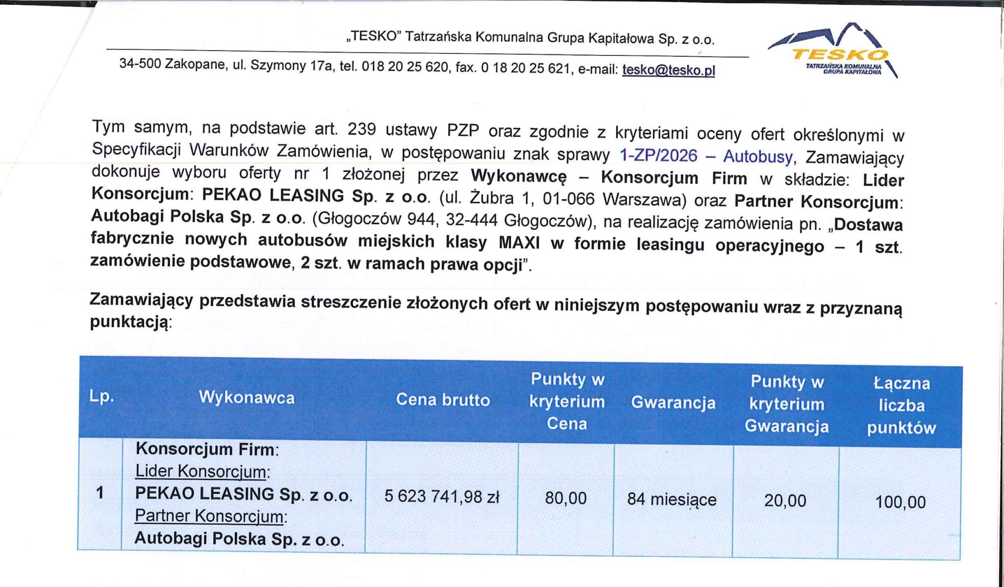 24 marca 2026 roku zapadła decyzja o wyborze najkorzystniejszej oferty w przetargu na dostawę trzech autobusów miejskich dla Zakopanego.