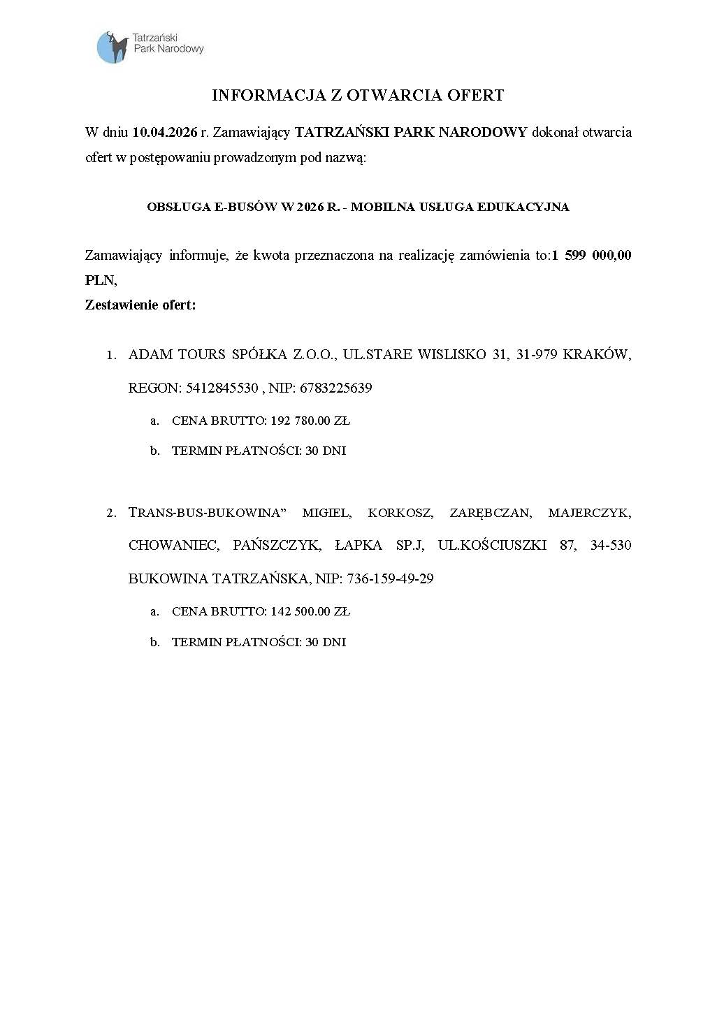 10 kwietnia 2026 roku Tatrzański Park Narodowy dokonał otwarcia ofert w przetargu na obsługę przewozów edukacyjnych autobusami elektrycznymi.