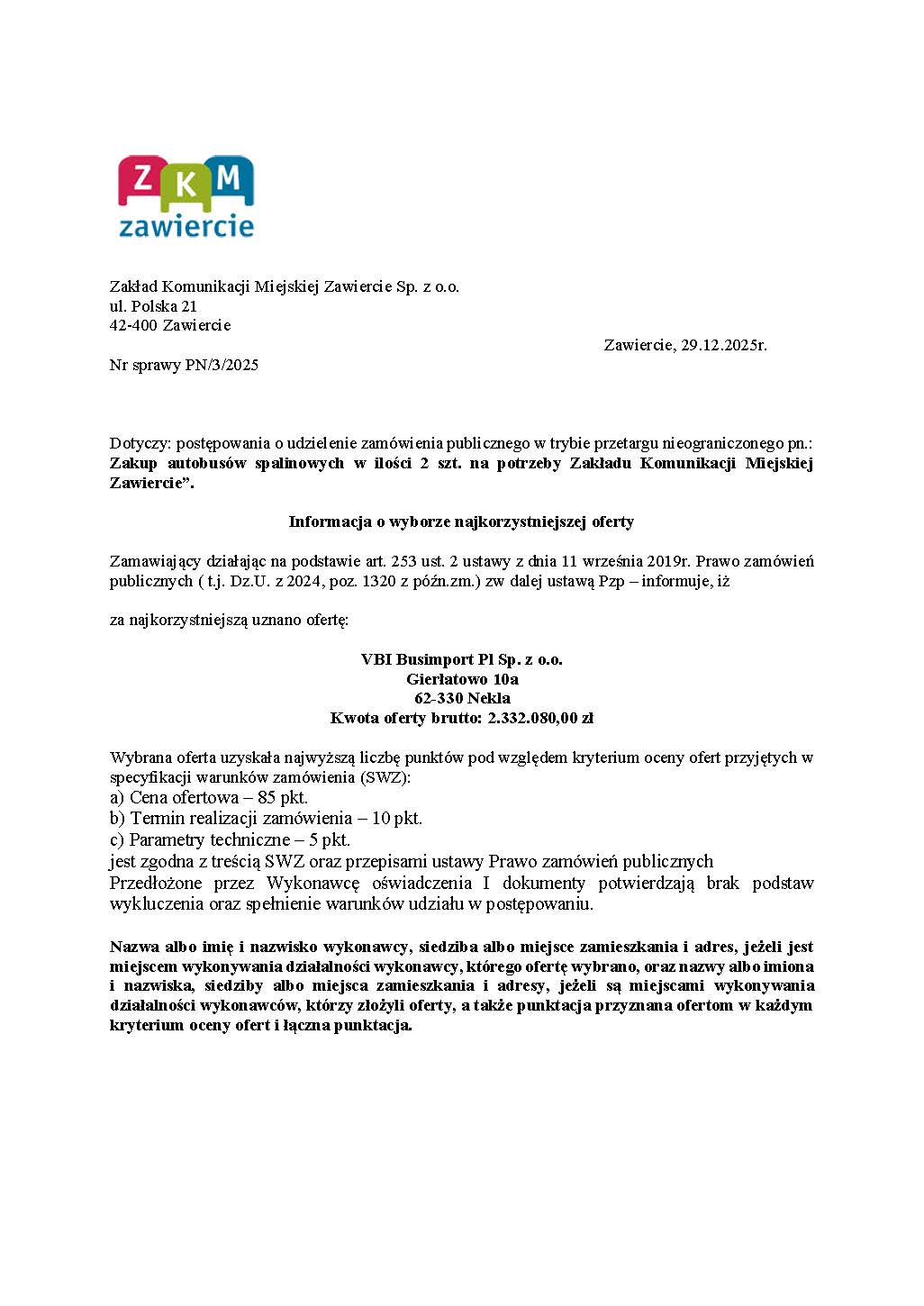 2 października 2025 roku Zakład Komunikacji Miejskiej w Zawierciu ogłosił przetarg w trybie procedury otwartej na dostawę dwóch fabrycznie nowych autobusów miejskich spalinowych. ZKM oczekiwał z tego zamówienia konkretnego, uniwersalnego autobusu miejskiego, który: