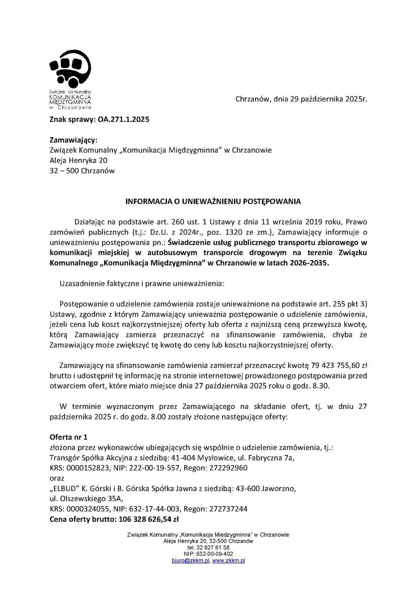 30 października 2025 r. Związek Komunalny „Komunikacja Międzygminna” w Chrzanowie poinformował o unieważnieniu postępowania przetargowego na obsługę komunikacji miejskiej w aglomeracji w latach 2026–2035.