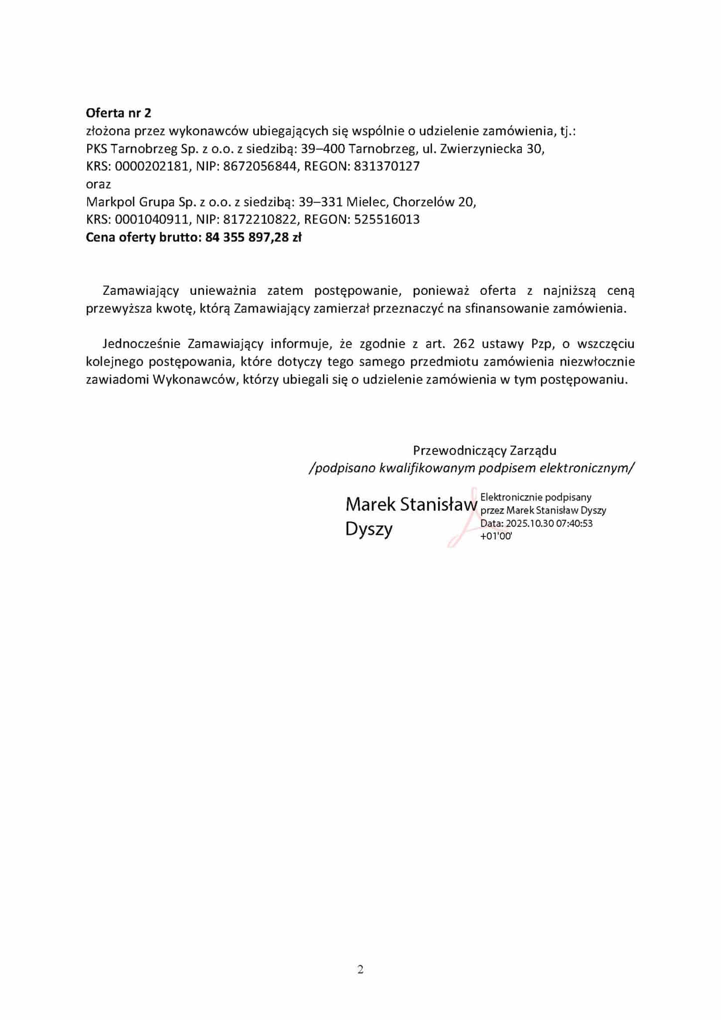 - PKS Tarnobrzeg Sp. z o.o. + Markpol Grupa Sp. z o.o. – 84.355.897,28 PLN brutto / 78.107.312,30 PLN netto, co daje cenę jednostkową netto za jeden wzkm na poziomie 8,95 PLN.