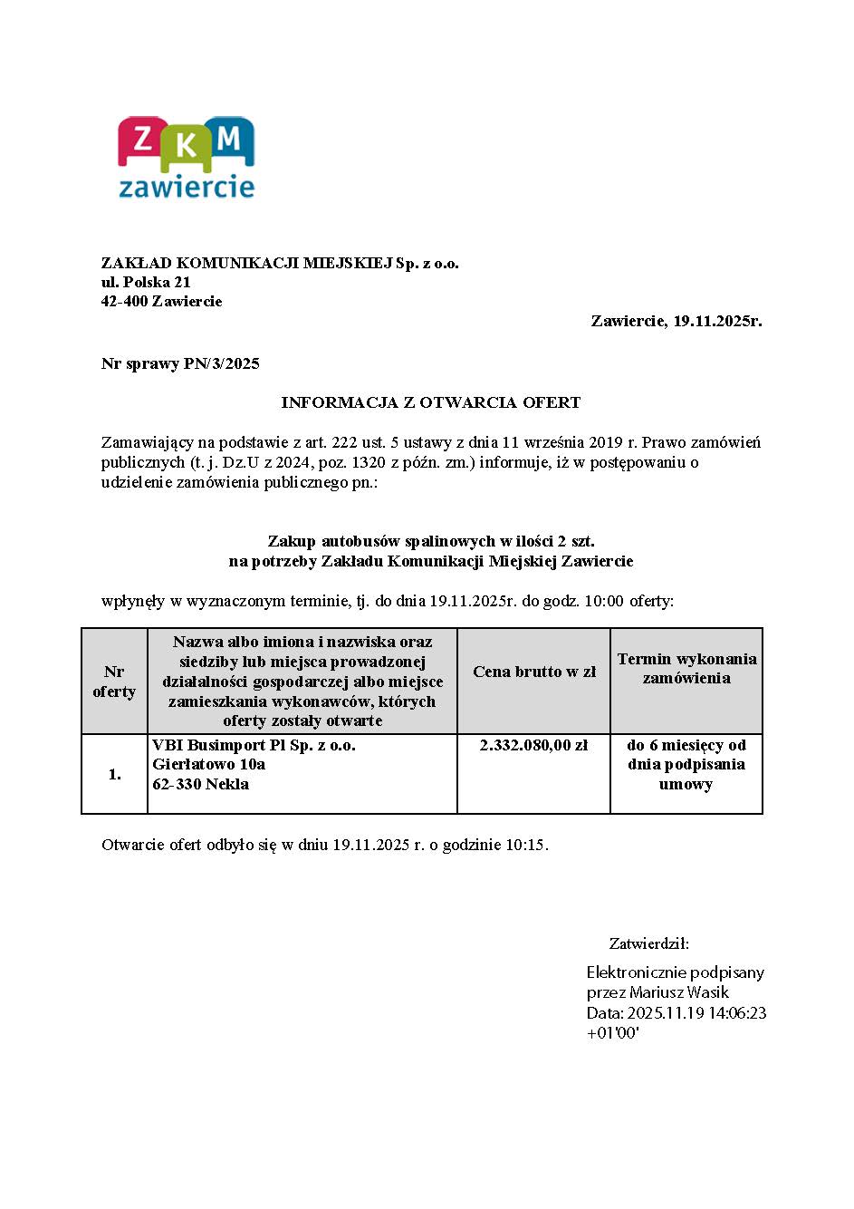 9 listopada 2025 roku Zakład Komunikacji Miejskiej w Zawierciu otworzył oferty w przetargu na zakup dwóch spalinowych autobusów klasy I kategorii MINI.