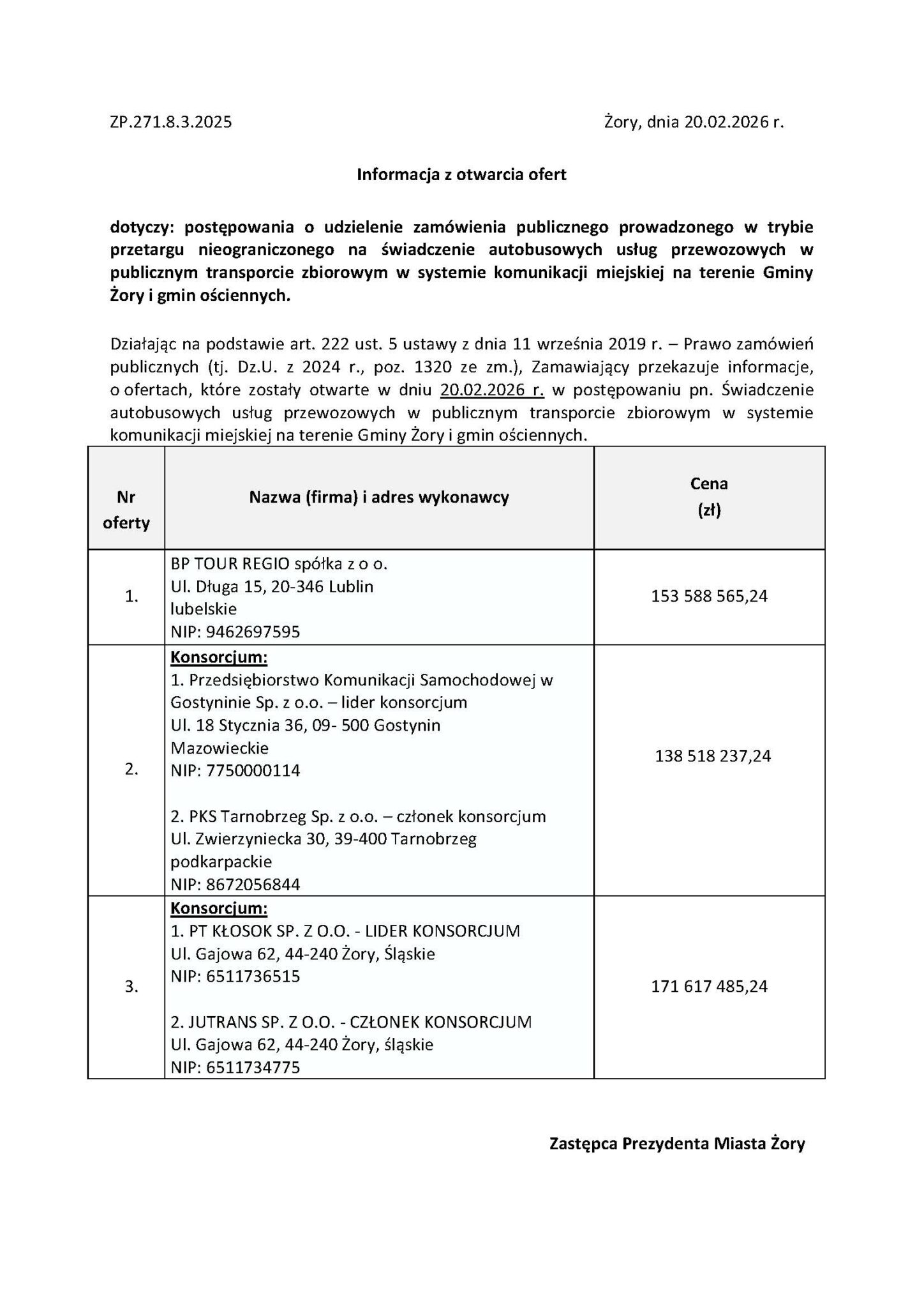 20 lutego 2026 r. w Urzędzie Miasta Żory otwarto oferty w ponowionym przetargu na świadczenie autobusowych usług przewozowych w systemie bezpłatnej komunikacji miejskiej.