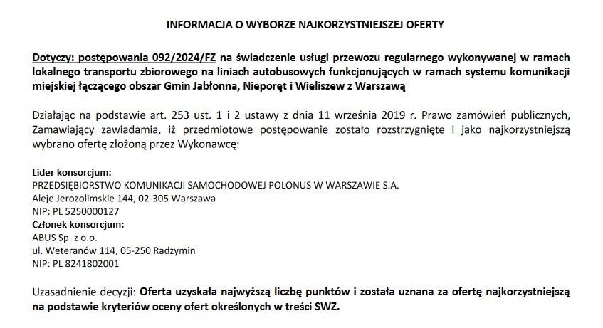 Termin składania ofert w przetargu numer 3 został przesunięty na 25 września 2024 roku. W tym dniu wpłynęła do Zarządu jedna propozycja – od konsorcjum: Przedsiębiorstwo Komunikacji Samochodowej Polonus w Warszawie plus ABUS Radzymin – na sumę 35.979.767,76 PLN brutto.