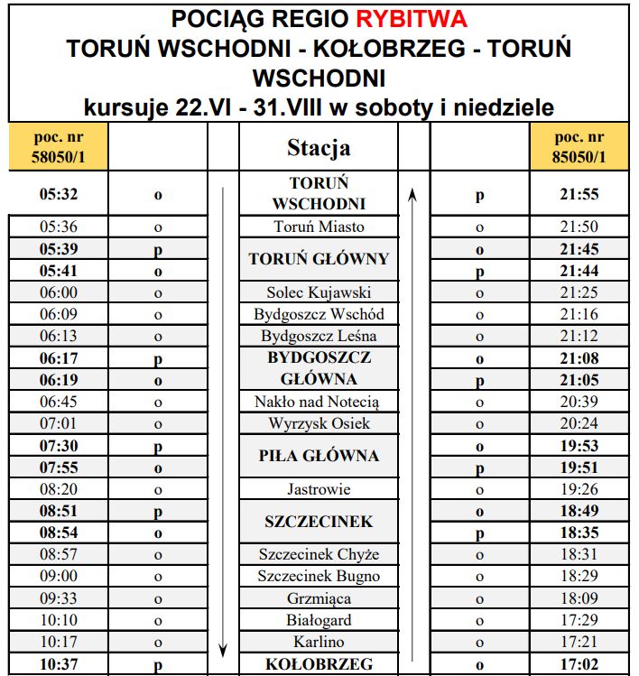 Pociąg ,,Rybitwa” swój kurs rozpocznie w Toruniu Wschodnim o 5:32, a o 10:37 zawita w Kołobrzegu. Podróżni będą mogli również liczyć na drogę powrotną znad morza. Pociąg wyjedzie o 17:02 z Kołobrzegu, a do Torunia Wschodniego dotrze o 21:55.