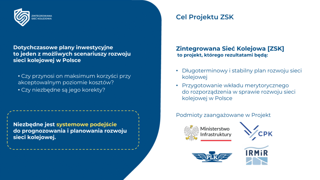 Centralny Port Komunikacyjny (CPK), we współpracy z PKP Polskimi Liniami Kolejowymi oraz Instytutem Rozwoju Miast i Regionów, pod patronatem Ministerstwa Infrastruktury, rozpoczął prace nad Zintegrowaną Siecią Kolejową (ZSK).