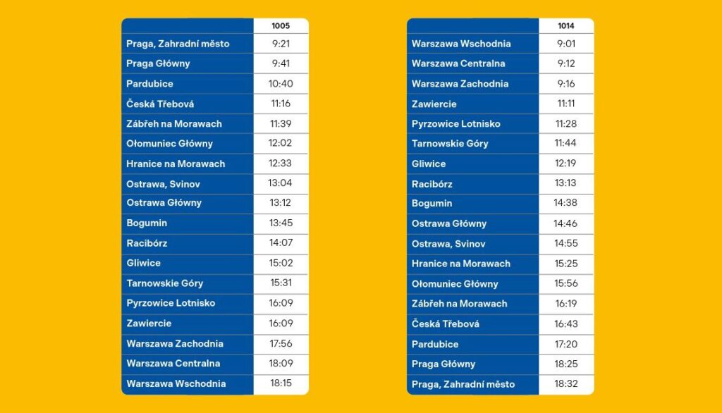 - Gdynia – Gdańsk – Warszawa – Katowice – Ostrawa – Praga