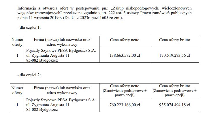 Oferty złożone przez Pojazdy Szynowe PESA Bydgoszcz S.A. w obu częściach postępowania przekraczają kwoty, które zamawiający zamierzał przeznaczyć na sfinansowanie zakupu. W przypadku części 1 oferta jest wyższa od budżetu zamawiającego o ponad 27 milionów złotych brutto, natomiast dla części 2 różnica wynosi blisko 175 milionów złotych brutto.