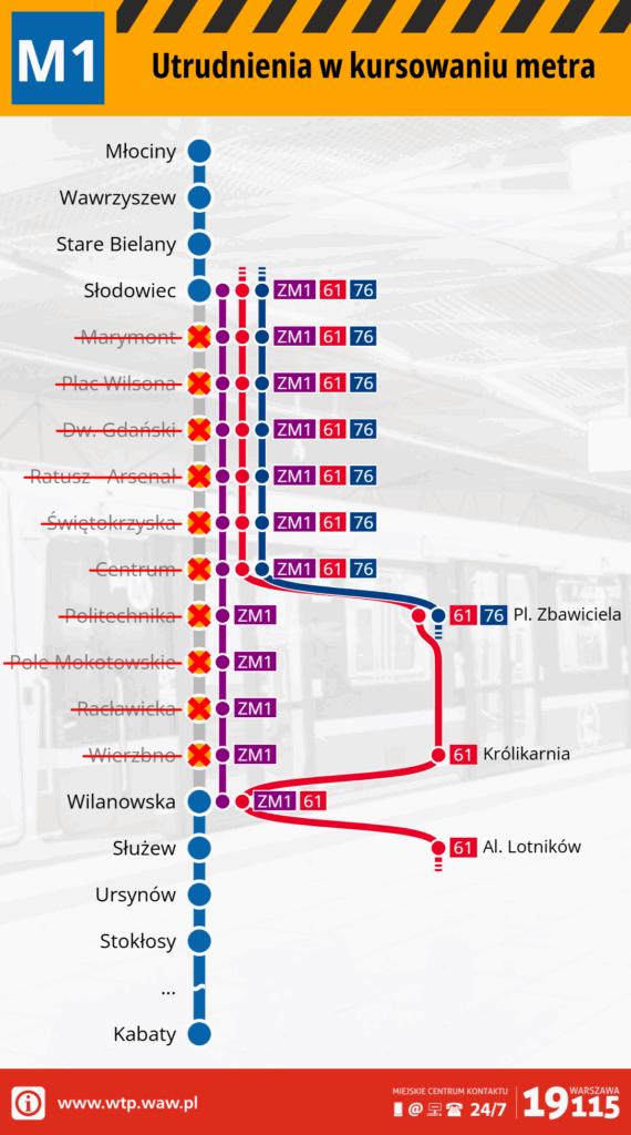 W czwartek 13 listopada wieczorem, na kilku stacjach metra linii M1 rozpocznie się wymiana urządzeń sterowania ruchem oraz podstacji energetycznej. Do końca kursowania – w niedzielę 16 listopada – pociągi nie będą jeździły na trasie Wilanowska – Słodowiec. Podróżnych przewiozą zastępcze autobusy i tramwaje.