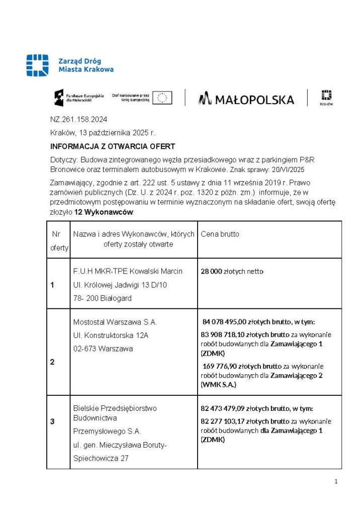 13 października 2025 roku Zarząd Dróg Miasta Krakowa opublikował informację z otwarcia ofert w przetargu na budowę zintegrowanego węzła przesiadkowego P&R Bronowice.