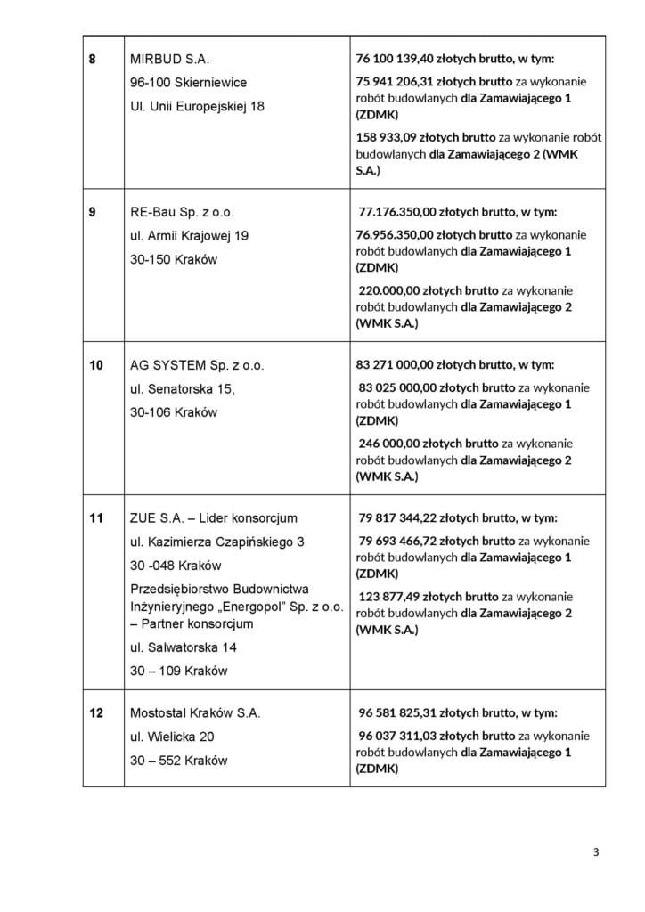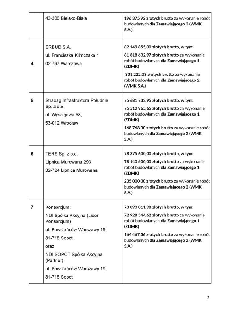 Z kolei kwota przewidziana na realizację zamówienia wynosi 78.093.700,27 PLN brutto, z czego 77.896.737,00 PLN pokrywa ZDMK, a 196.963,27 PLN – spółka WMK S.A. Oznacza to, że oferta NDI mieści się w budżecie i pozostawia margines na ewentualne prace dodatkowe.