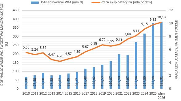 Równolegle rosną nakłady finansowe. Środki na organizację przewozów kolejowych zwiększono ze 123 mln zł w 2018 roku do 385 mln zł w 2026 roku. Dzięki temu uruchomiono nowe połączenia m.in. do stacji Rabka-Zaryte oraz na trasach Bielsko-Biała – Wadowice – Kraków i Częstochowa – Kraków. W grudniu 2025 r. wprowadzono także dodatkowe nocne kursy na liniach SKA1, SKA2 i SKA3, umożliwiając powroty do podkrakowskich miejscowości po godzinie 1:00.