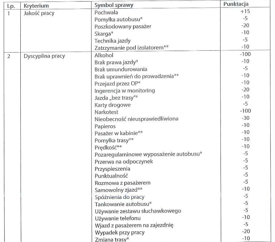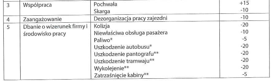 Udostępniony w mediach społecznościowych fragment tabeli był roboczym materiałem i nie przedstawiał pełnego obrazu projektowanych rozwiązań. Zawarte w nim uproszczone sformułowania – precyzyjnie opisane i osadzone w szerszym kontekście w innych częściach dokumentu – po wyrwaniu z całości mogły zostać niewłaściwie zinterpretowane. Przykładowo, użyte w tabeli hasło „punktualność” odnosiło się wyłącznie do przypadków odjazdu przed czasem, a nie do opóźnień wynikających z korków, awarii czy innych niezależnych od pracownika przyczyn. Z kolei określenie „przerwa” nie dotyczyło samego korzystania z należnego odpoczynku, lecz do sytuacji naruszenia obowiązkowych zasad BHP oraz przepisów wynikających z ustawy o czasie pracy kierowców. Podobnie, zapis „wypadki przy pracy” odnosił się wyłącznie do rażących naruszeń przepisów bezpieczeństwa, takich jak praca bez wymaganych środków ochrony, a nie do zdarzeń losowych.